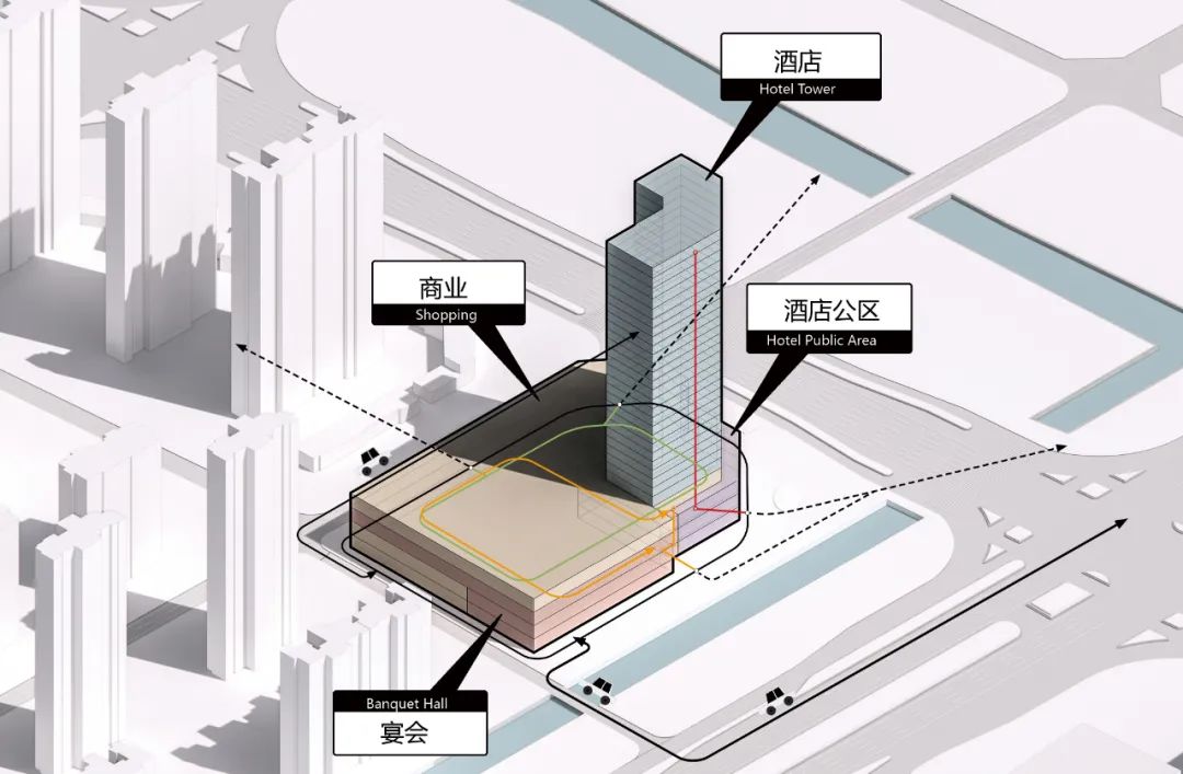 酒店设计上的一大难点在于如何将众多的公共配套集约地设置在有限的裙房区域,在这方面我们主要采取了几个措施:一是在保证空间品质和体验的前提下,从客房到公区的配置都尽量按万豪酒店设计标准的较低值来考虑;二是利用有限的场地条件尽可能的将几个大的功能区块和主要流线区分开;三是综合处理酒店宴会厅、商业裙房和酒店公区的内部空间关系,让他们互不交叉但能进行便捷的联系。