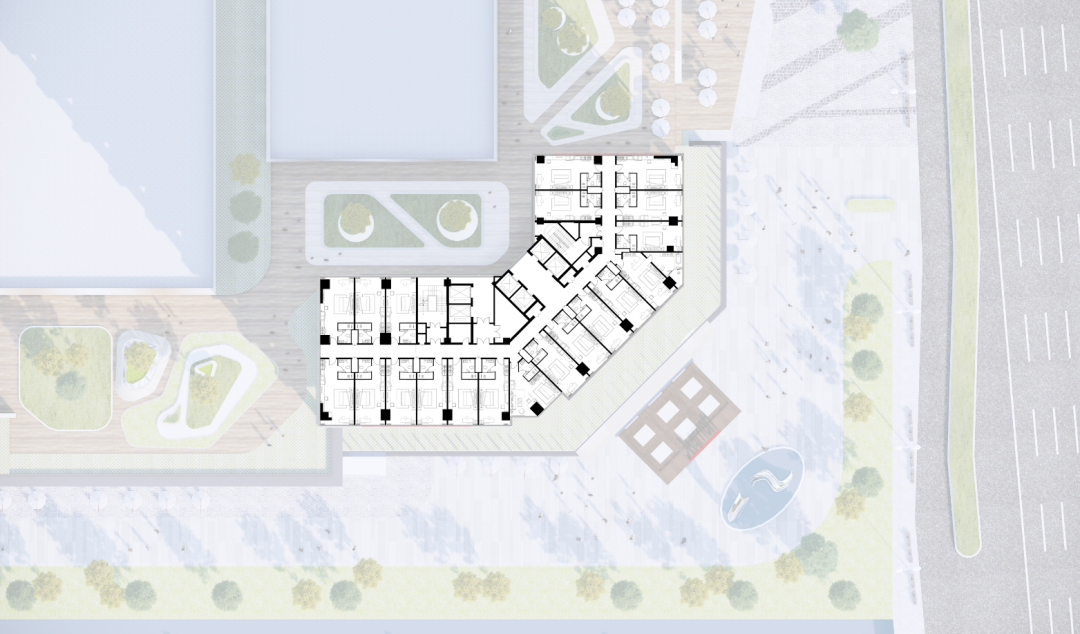 通常我们看到的超高层常采用的是塔楼的布置形式,核心筒在中央。但是这种形式排布的客房数量有限,再加上建筑高度的限制,客房面积总量很难做足。所以从平面效率上看,板楼这种用走廊连接两侧客房的形式最为高效。同时,酒店的平面轮廓沿着用地边界排布成三段折线,往上拉升形成建筑体量,贴合城市转角。