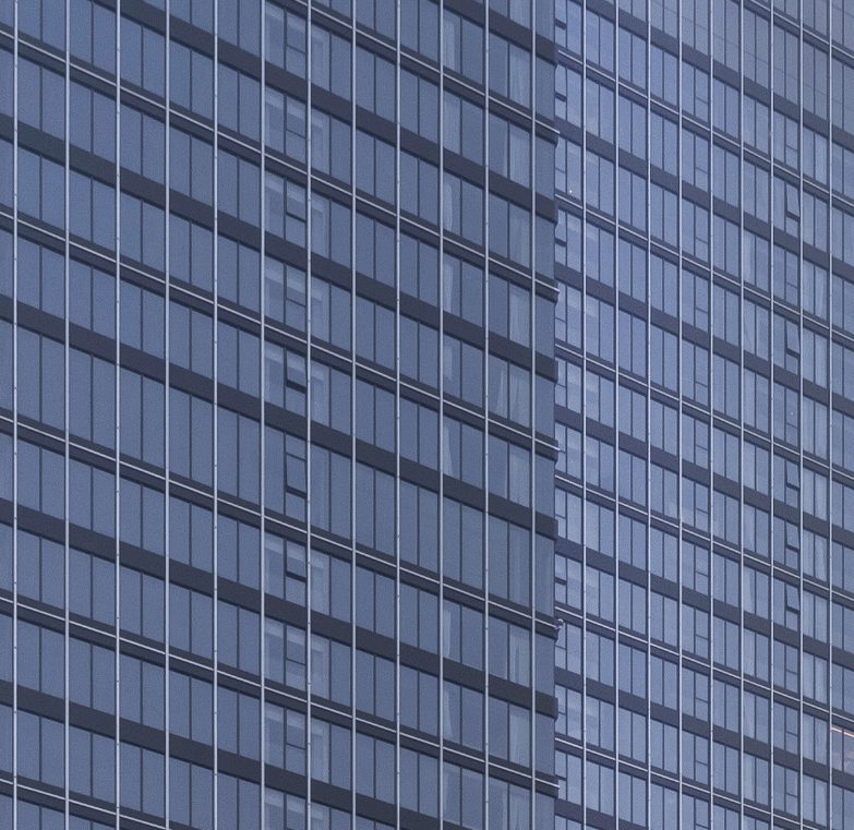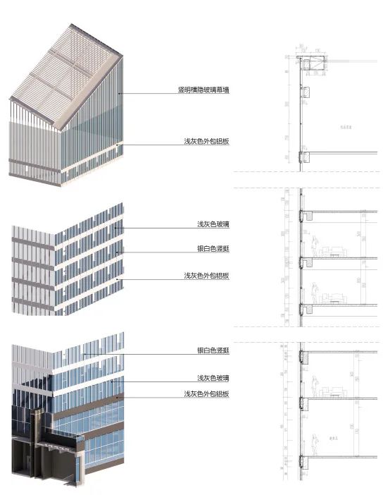 这两种体系最大的区别在于外立面平整度的差异,窗墙体系的层间梁位会凸出于玻璃平面形成明显的横向线条。于是我们根据主塔玻璃在正常日光条件下反射形成的整体立面颜色,来选择确定各层梁位上的外包铝板颜色。