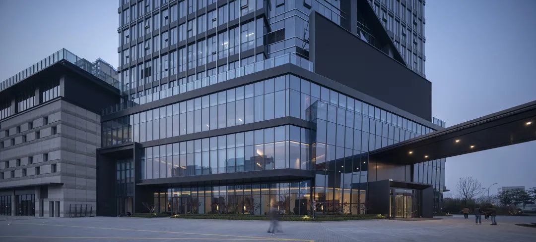 整个主塔底部也被设计成了斜切的造型与塔冠相呼应,形成整体统一的效果。