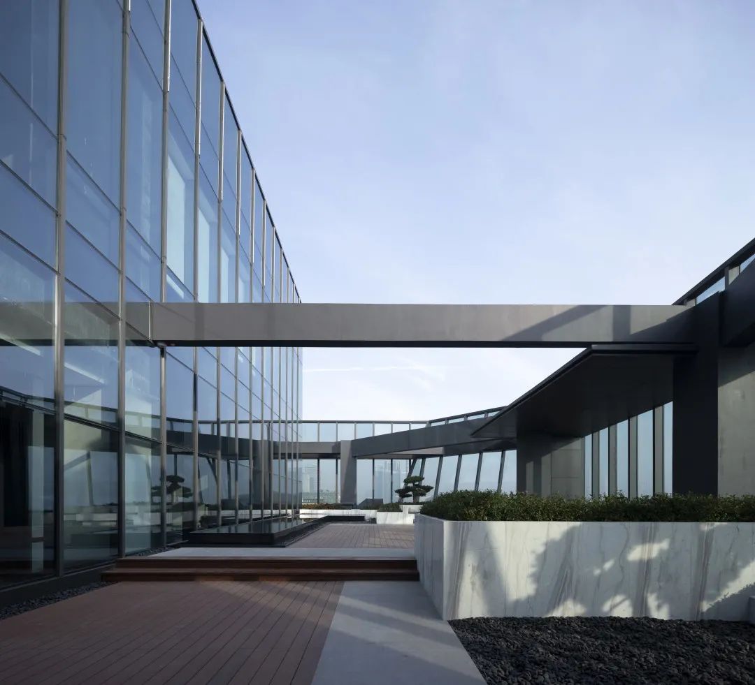 同时,在建筑主体之上加设塔冠,两部分一高一低增强垂直方向的层次,并同时形成内高外低的斜切轮廓,强化中央的高耸感和上升的动态气势。