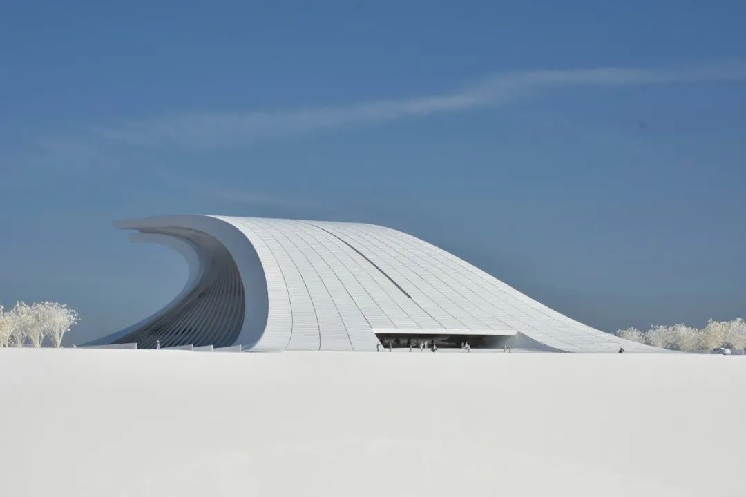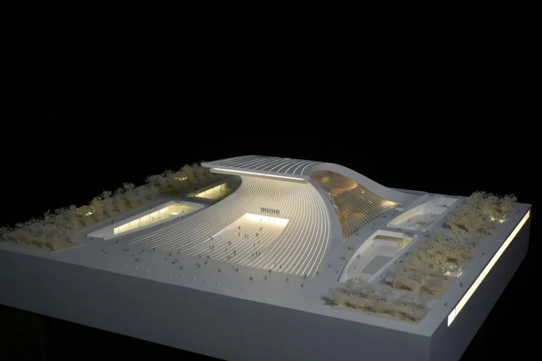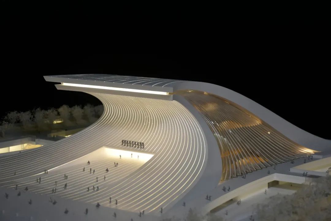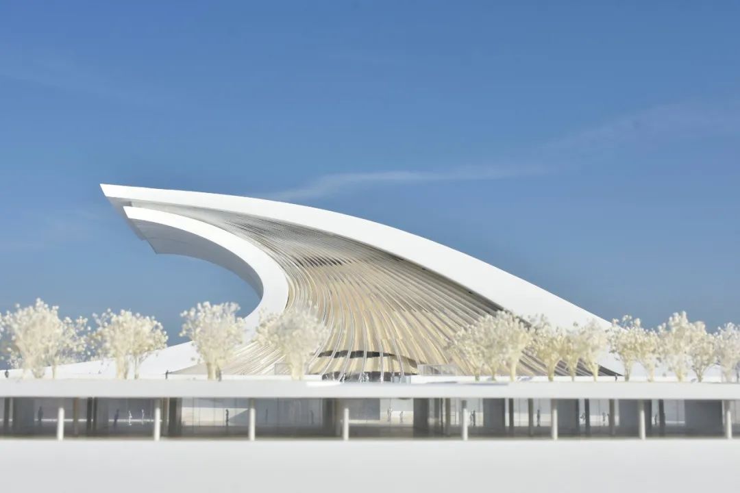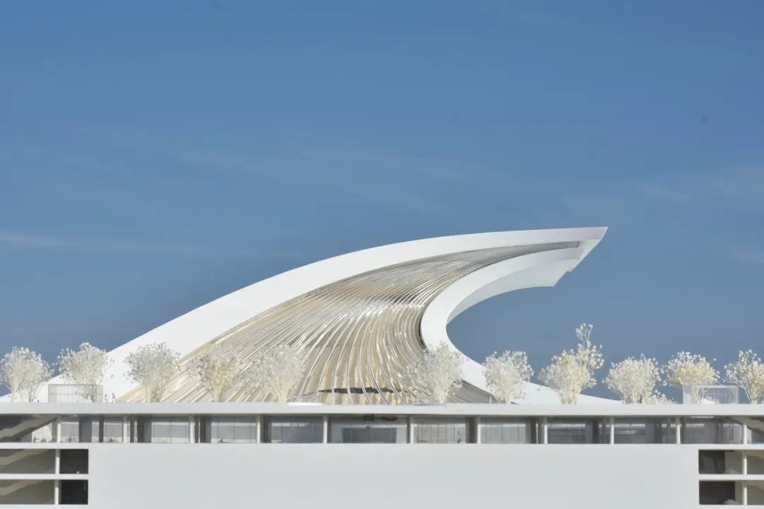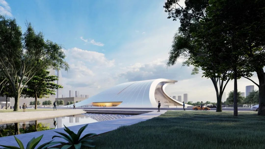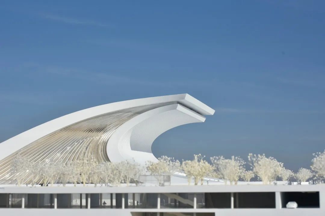在建筑策略上,方案用简洁的手法,凝练出大气磅礴的巨浪形象,两块巨大的弧形飘板前后搭接,寓意前浪不止、后浪不息的创新活力。建筑整体通过极简的象征手法,渲染劈浪斫风的空间氛围,充分展示了改革开放敢为人先、勇立潮头的探索精神与民族力量。我们以浪潮的意象为设计原点,为凝固的建筑赋予具有动势的外形,以具有纪念性和雕塑感的庄重体量回应浪潮的主题,旨在表征对改革开放这一时代浪潮的凝思与展望。