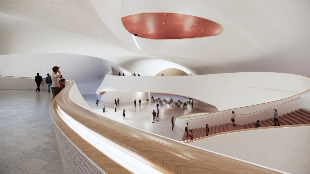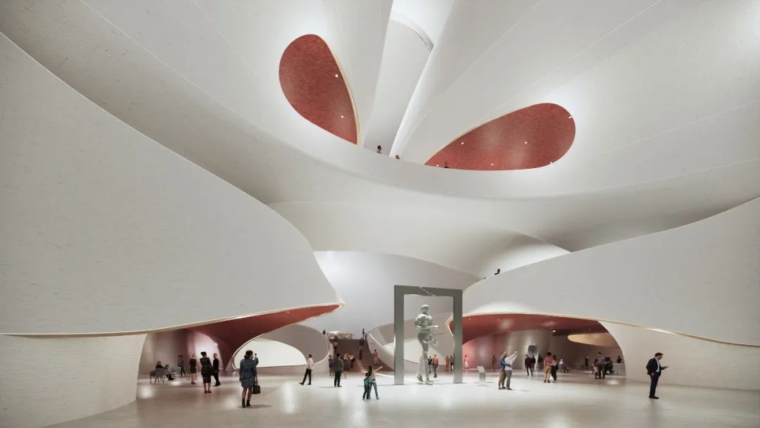 在建筑两侧玻璃幕墙下设有流线形涌动的内展墙,可有效地提升空间的采光品质。幕墙与内展墙之间的边庭提供观展游客远眺城市景观的休息场所。