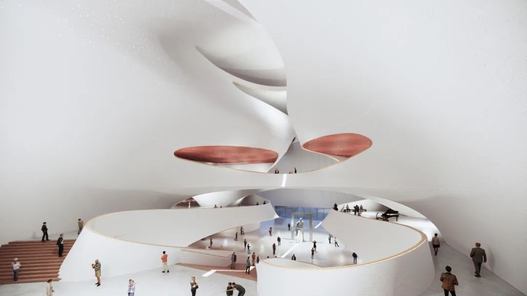建筑内部的空间围绕“凝固的巨浪,流动的空间”设计。起伏交错的内部流线型空间与外部建筑浪潮造型交相呼应,白墙红顶的设计凸显展览馆庄重典雅的气质,也映衬出改革开放主题精神。