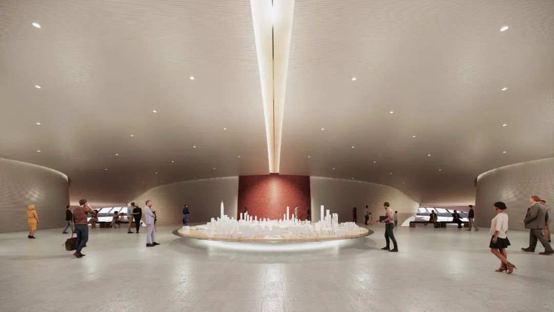 方案延续南北景观绿轴,形成北面市民公园与南面纪念广场。 纪念广场面向深南大道,具有开放性和公共性,可作为重大节日庆典的活动场所。 东西两侧设置公共城市景观来衔接城市界面,并设有下沉广场与地下商业无缝接驳地铁站点、金融文化中心与国际演艺中心。
