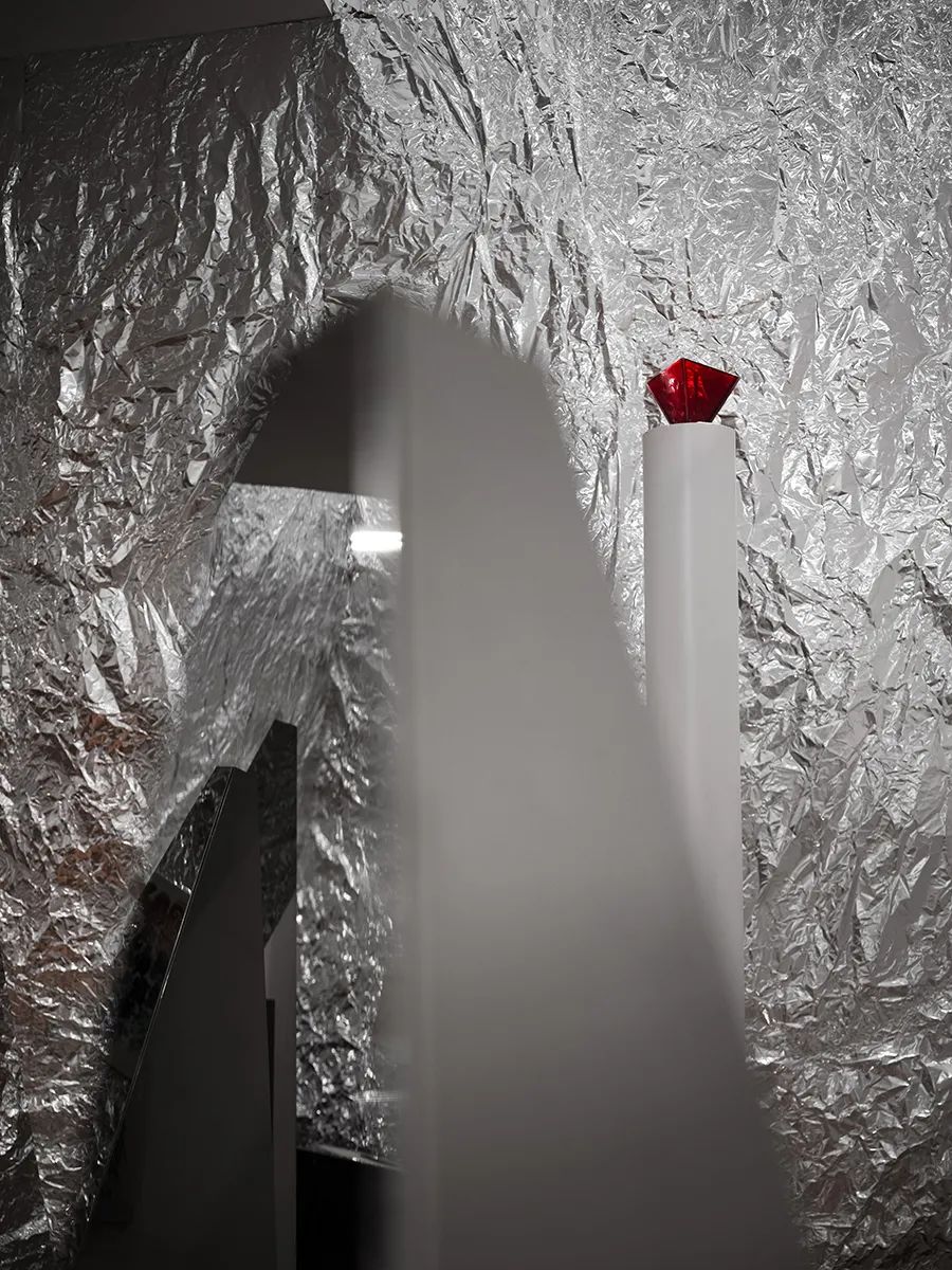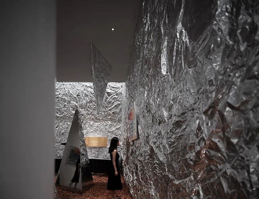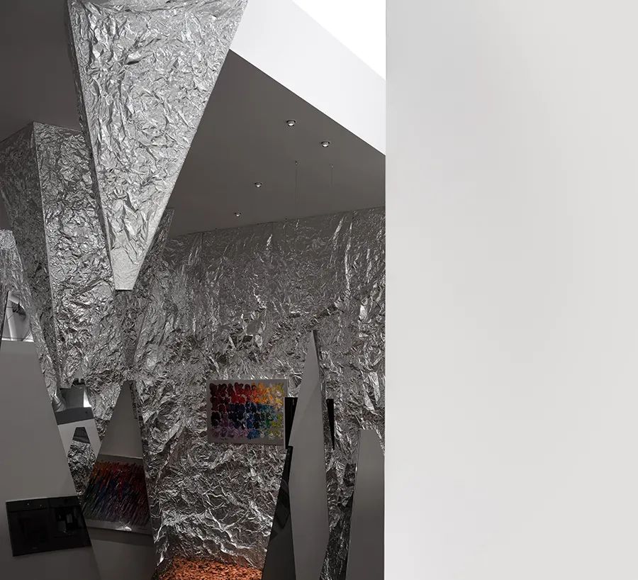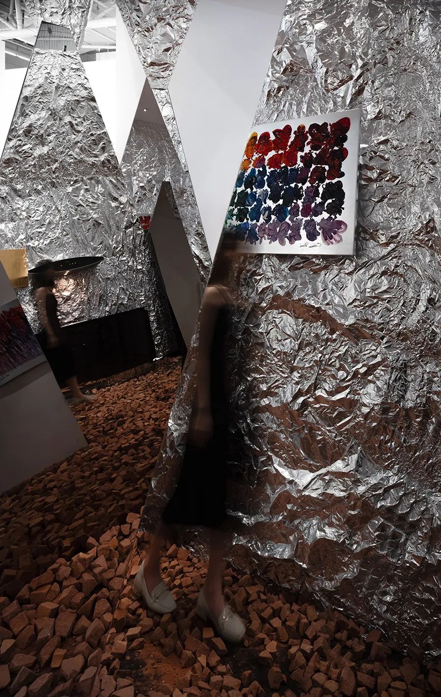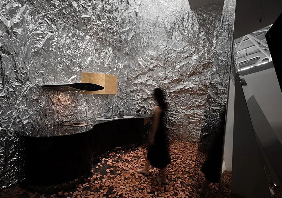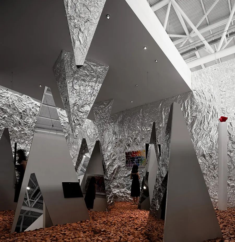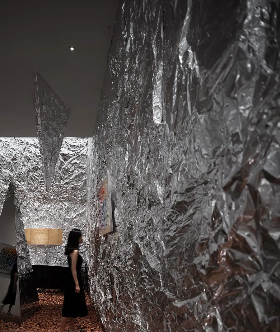 地面的红色丹霞碎石给人观展的过程产生危险与意外的信号,这是在视觉以为所获得的体验。这种体验是可以直接刺激我们的大脑的。而墙面的褶皱金属质感,通过视觉的冲击,吸引人的感观。