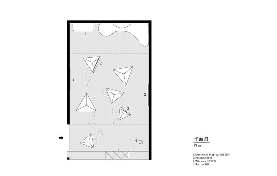 考虑到观展的人流密集,设计通过三角形来分割空间,创造一个拥有自由度的同时拥有方向性的情景,其目的是更好的让看展览的人更好流动起来,让本该固定的观展流线变得自由并且节奏丰富。