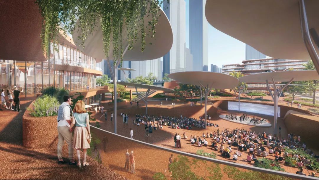 结合了步行友好的景观和包含了公共交通的20余种功能,“深圳露台”将成为整片区域的可持续发展枢纽。丰富的植被和水景降低了室外温度,为城市里的野生动物提供了栖息地;花园和雨水收集系统可以种植食物和并循环利用水资源。