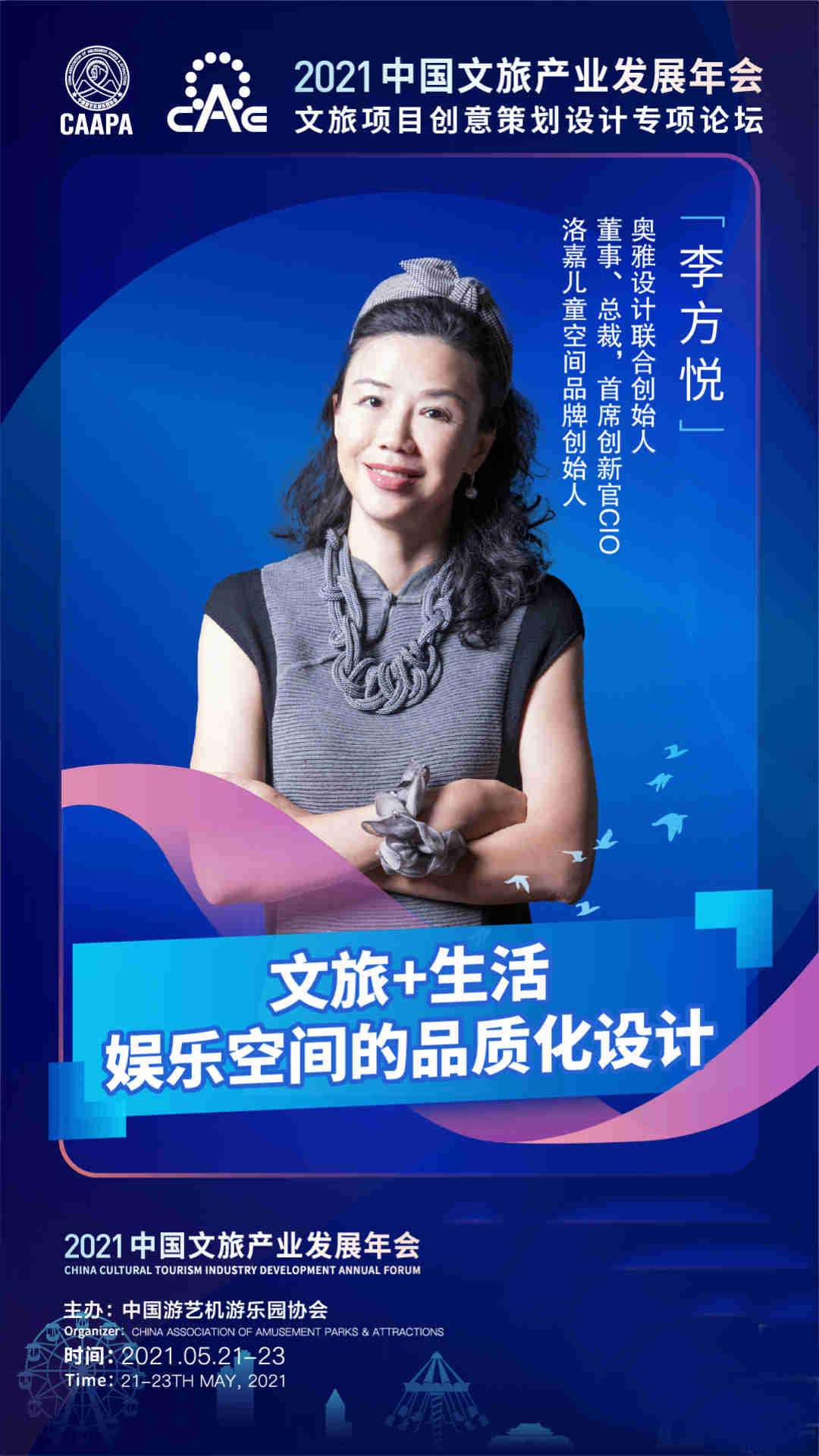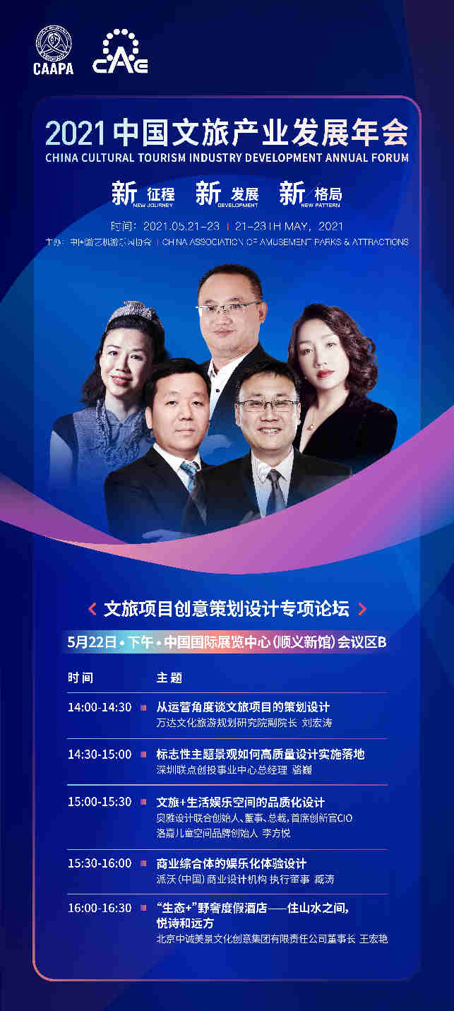 其中,5月22日将举办2021中国文旅产业年会——文旅项目创意策划设计专项论坛,会议邀请到华侨城华南集团、万达文化旅游规划研究院、奥雅设计等行业专家探讨文旅+生活娱乐空间的品质化设计、商业综合体的娱乐化体验设计等议题。奥雅设计联合创始人/董事/总裁/洛嘉儿童空间品牌创始人 李方悦女士受邀出席该论坛,并将发表演讲探讨“文旅+生活娱乐空间的品质化设计”。