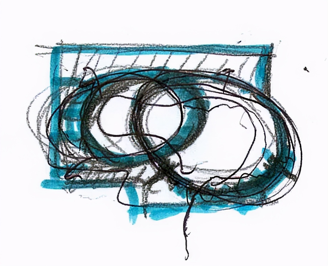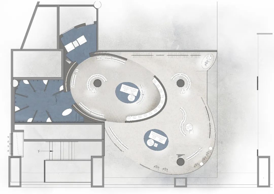 较小的圆环从地面倾斜升起,其线条向下延伸构成低矮的墙壁,分隔出一个独立的体量。与上层圆环的轻盈质感形成鲜明对比的是,下层圆环表面选用了质地更厚重的石膏,强化了反重力主题。设计通过地面两种色调的水磨石进一步引入了对比的手法;墙面由白色渐变为冷灰,更为室内空间注入了一丝动感。