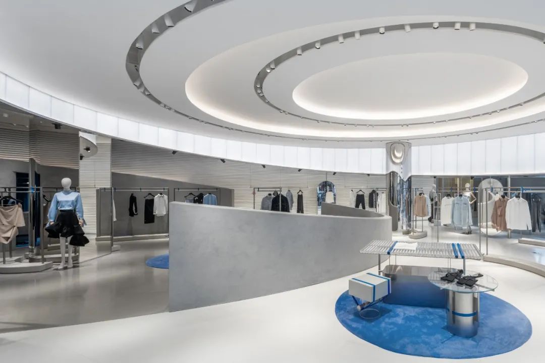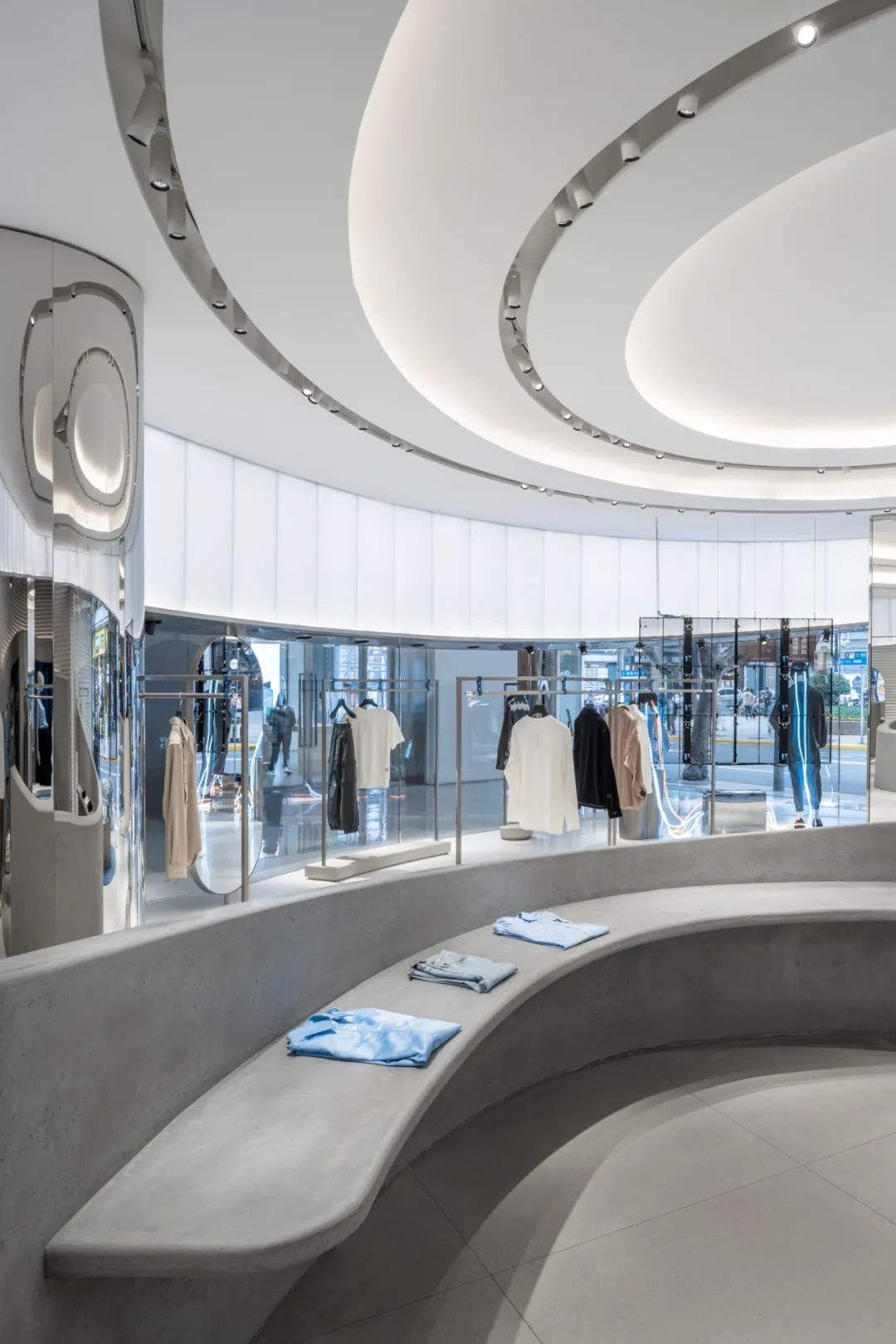 IEW.H埃维纽上海旗舰店以一种对抗地心引力的姿态融合了极具未来感的设计主题,引入生动的体量与形态,使其一跃成为上海主要商街中令人瞩目的焦点。设计通过材料间的鲜明对比与充满现代感的冷色调形成强烈的视觉张力,在上海的中心商街创造了别具一格的购物体验。