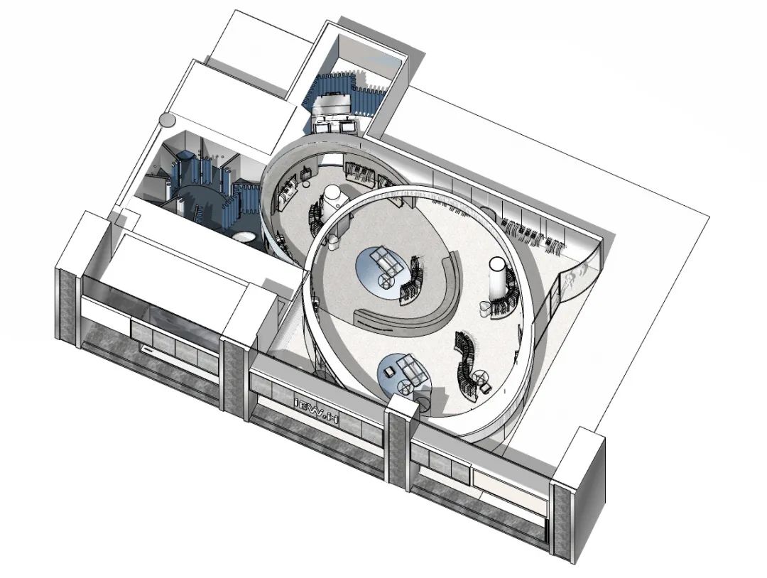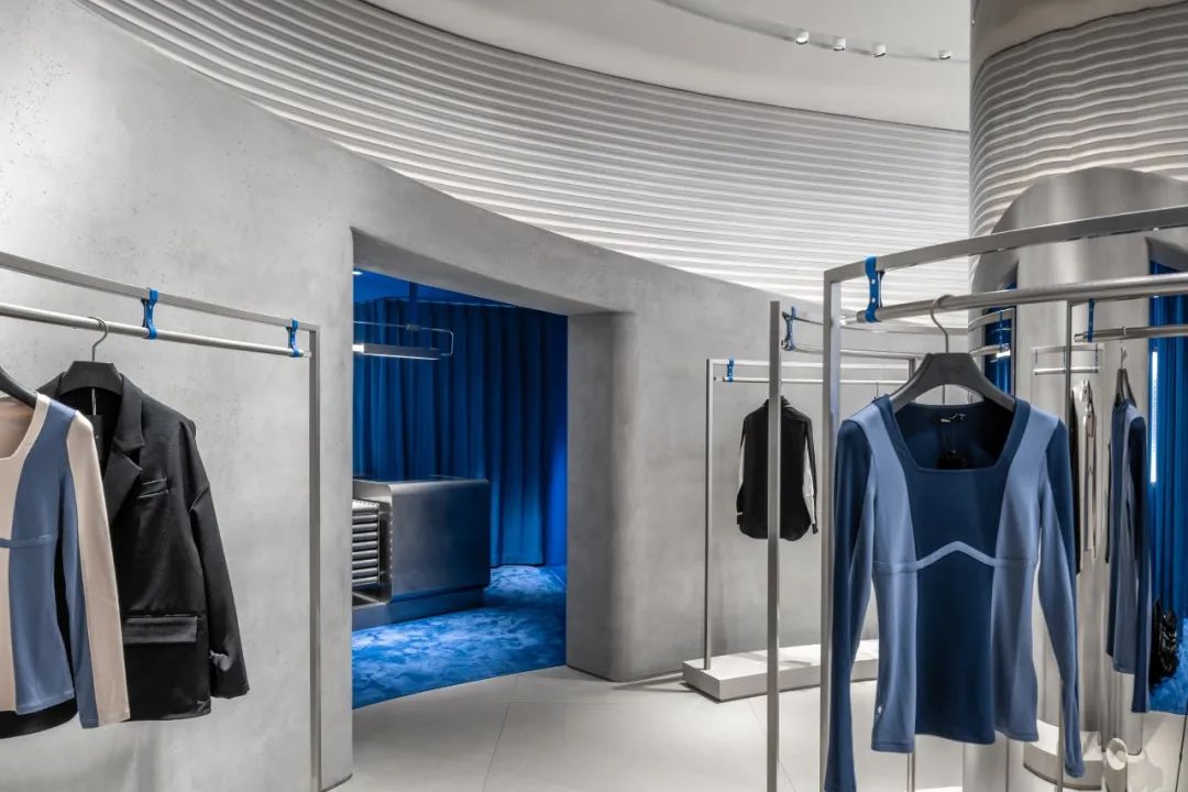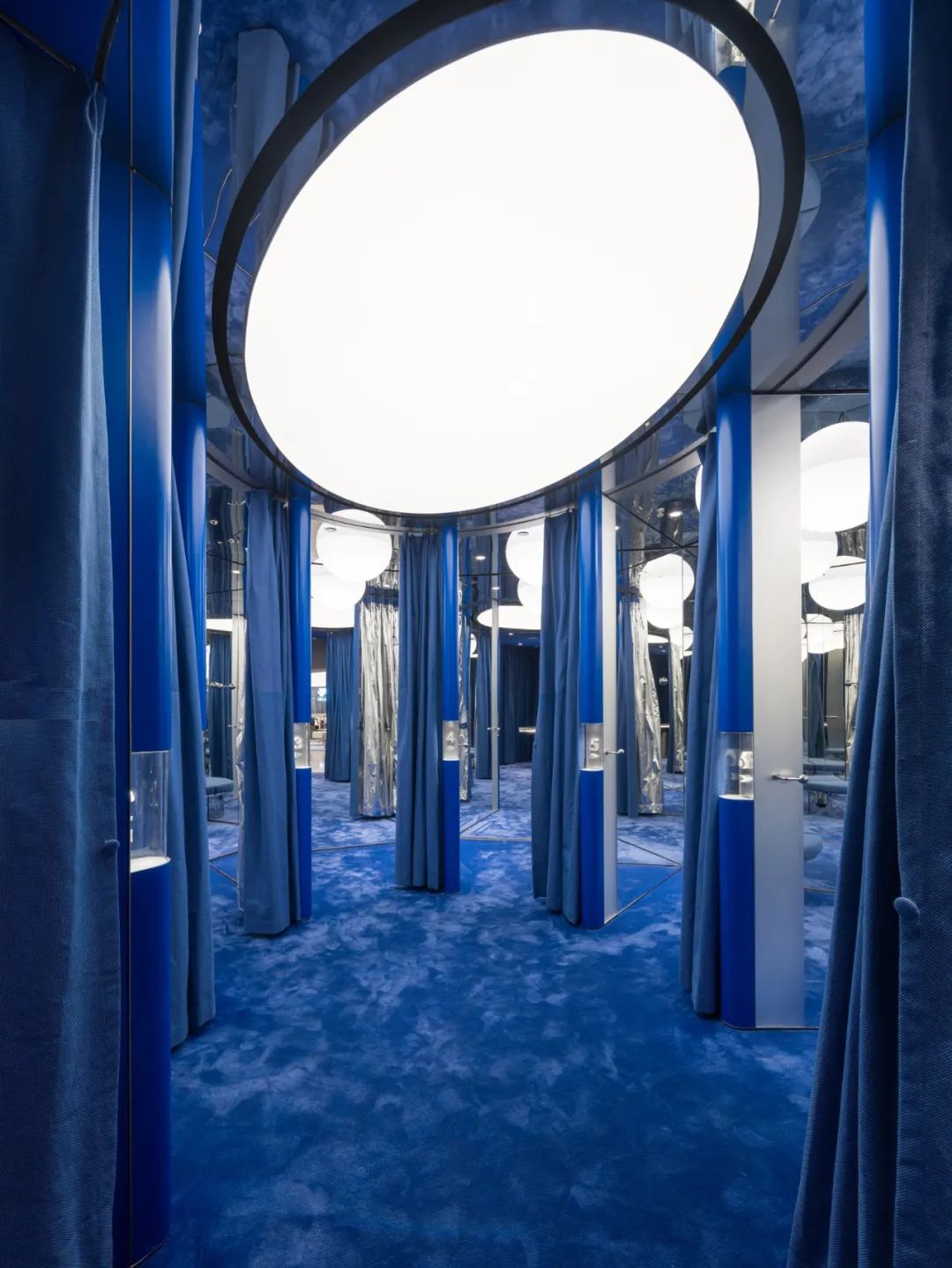 IEW.H埃维纽的试衣间可从小圆环进入,该区域以品牌色彩的天青蓝色与银灰为主基调,每间试衣间的镜面角度达270°,巧妙地打造出无限反射的万花筒效果。隔间的天花板也采用镜面设计,使得半球的灯体宛如漂浮在空中的星球。银色的收银台被置于相邻的侧室中,同样独立于两个交错环带外,两侧则是与主色调相同的深蓝色家具。