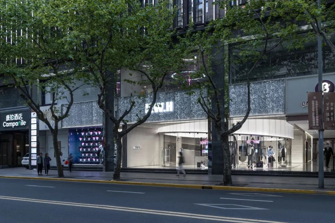 IEW.H埃维纽旗舰店位于上海繁华的淮海中路商街上,从内到外都彰显着极致的视觉冲击。由玻璃和铝制泡沫隔板筑成的立面完美契合其内部的未来主题,给人以超然的观感。这种金属材料由无数孔洞组成状似细胞的有机纹理,背面的灯光使其在夜晚熠熠生辉。店铺玻璃幕墙沿着街边曲线内退形成主入口,其圆柱形的店铺体量从淮海路标准化的齐平门头中脱颖而出,迅速吸引来往游人的注意,同时也提供了充足的橱窗陈列空间。