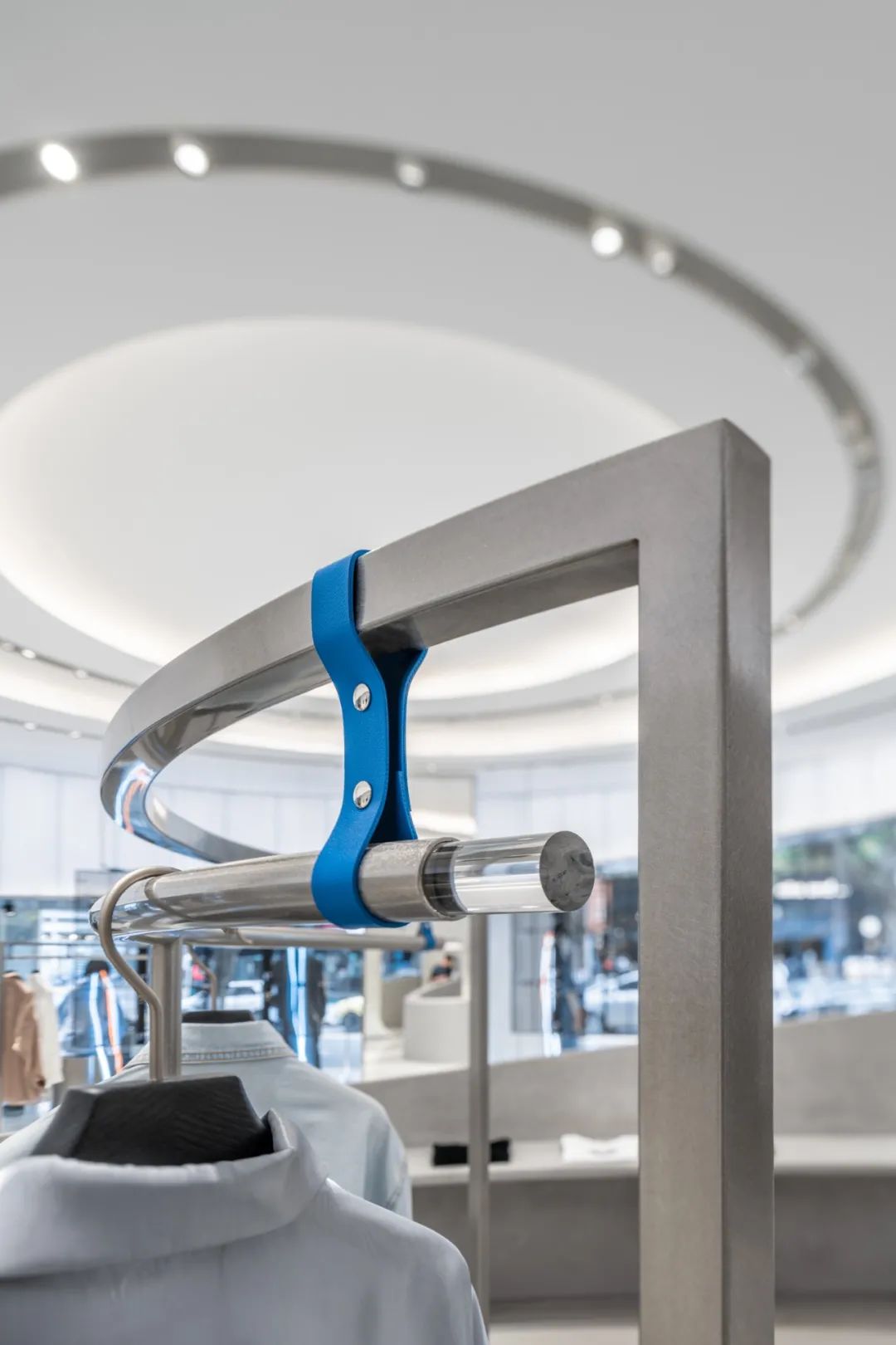 店铺的室内空间也延续了外立面的强烈视觉张力:展柜、长桌与陈列架等重点元素被置于两个相互交错的圆环内。较大的圆环悬浮于顾客的头顶,展现出贯穿项目始终的反重力概念。这个以聚碳酸酯为材料的环状结构配有内嵌式背光照明,极具建筑性。结构底部的不锈钢环带也随之微微倾斜,更强调了空间的紧凑感。