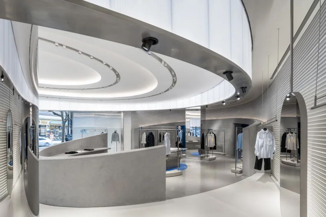 项目要求Kokaistudios在上海市中心设计一个超凡脱俗的零售空间,在259平米的场地内将时装品牌IEW.H埃维纽的未来主义概念转化为生动的设计语言。空间从行星轨道中获取灵感,临街立面选材独特,吸引来往行人踏足店内。空间不仅具有明显的建筑风格,其内置灵活性的设计更使店面易于根据日后的品牌合作、快闪店与其他活动进行调整。