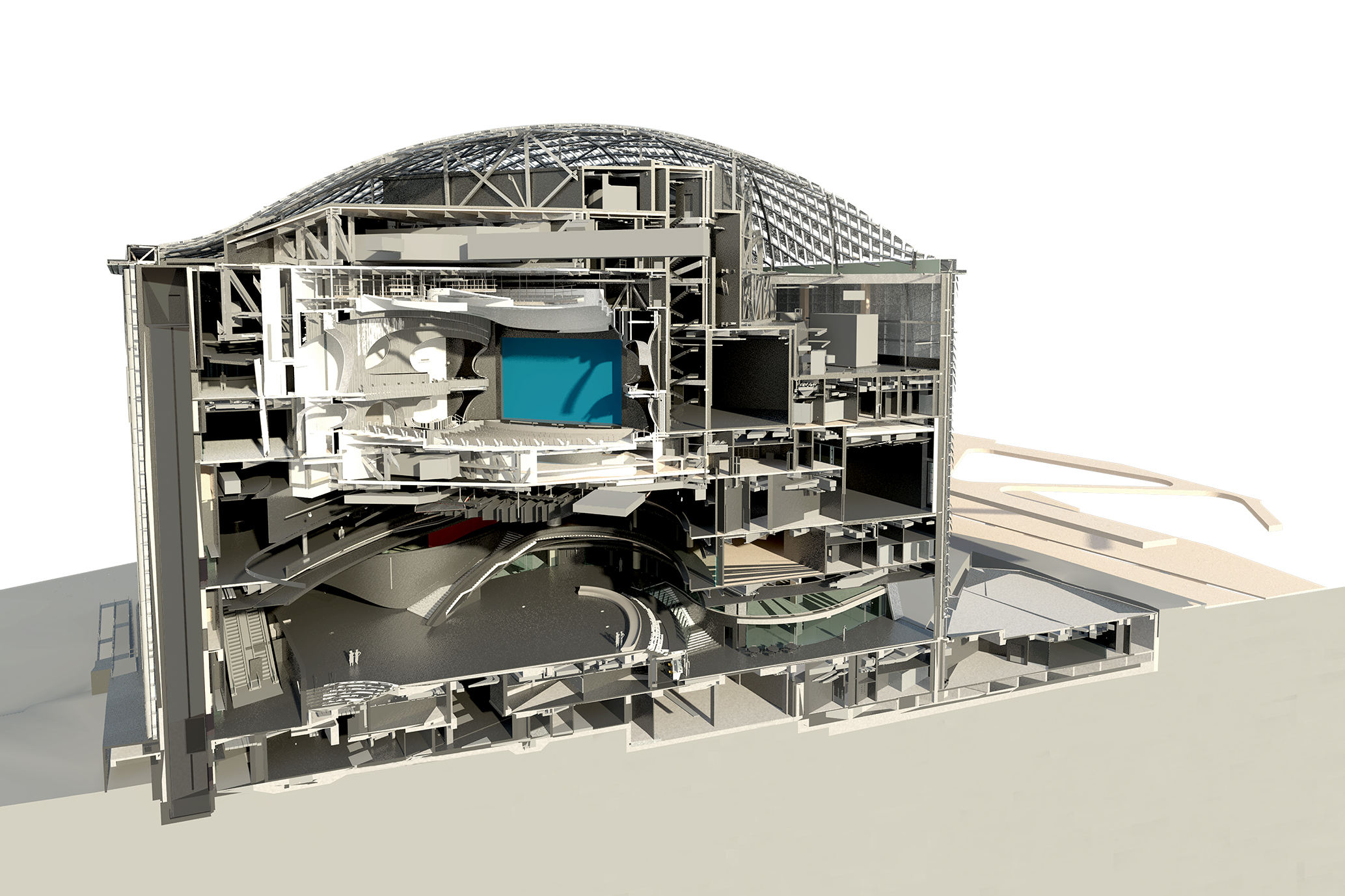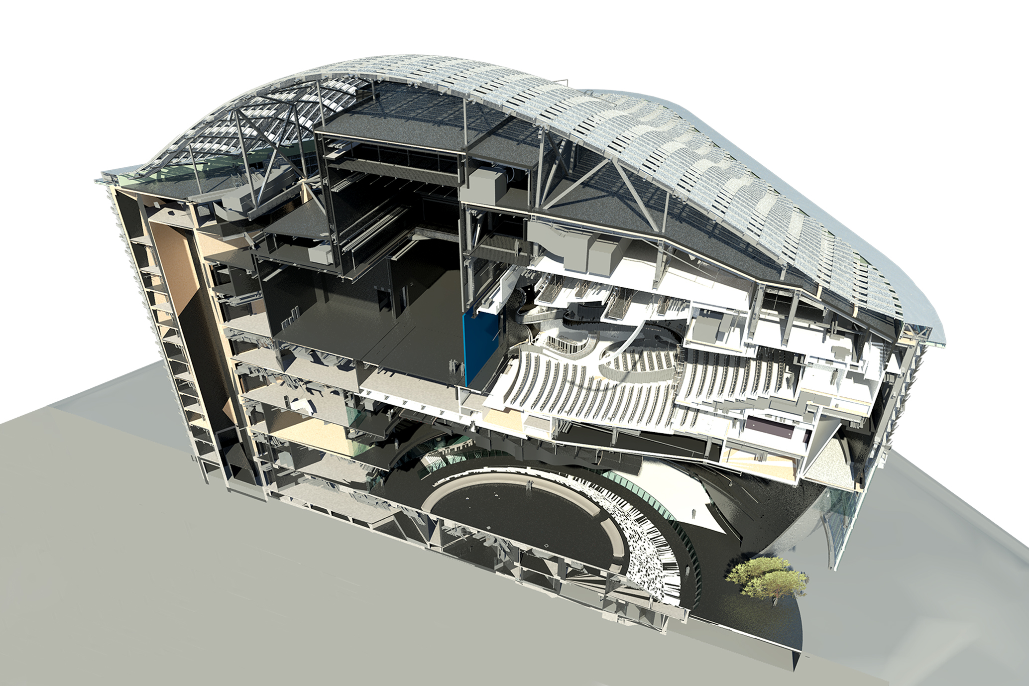 建筑师创新地运用BIM技术,并采取了多项数字化策略。建筑模型被区分成不同部分,以便划定不同的工作界面,避免在工程总包到室内装饰等各类分工之间形成混淆。BIM的运用优化了项目设计和建造的流程,尤其是对于像戏曲中心这样超复杂几何体构成的建筑。建筑师还在悬空的大剧场室内利用BIM测试得出兼顾视觉美感和吸音效果的结构布局,并采用Revit模型的三维尺寸标注,而非传统的二维图纸。