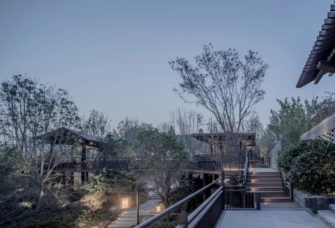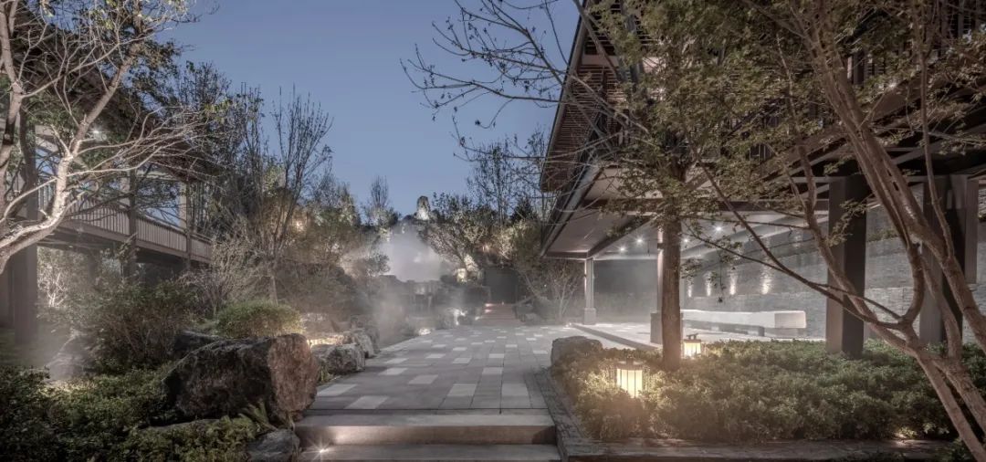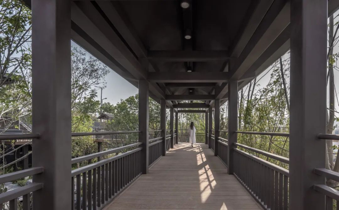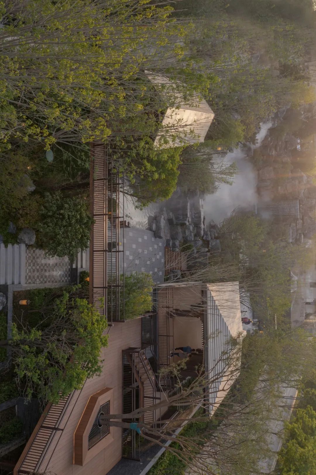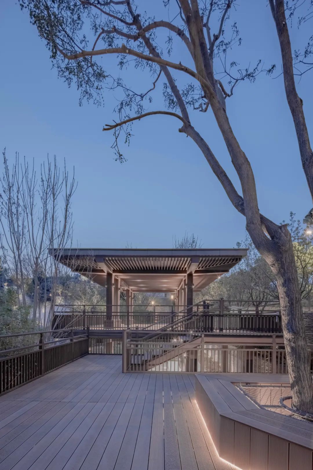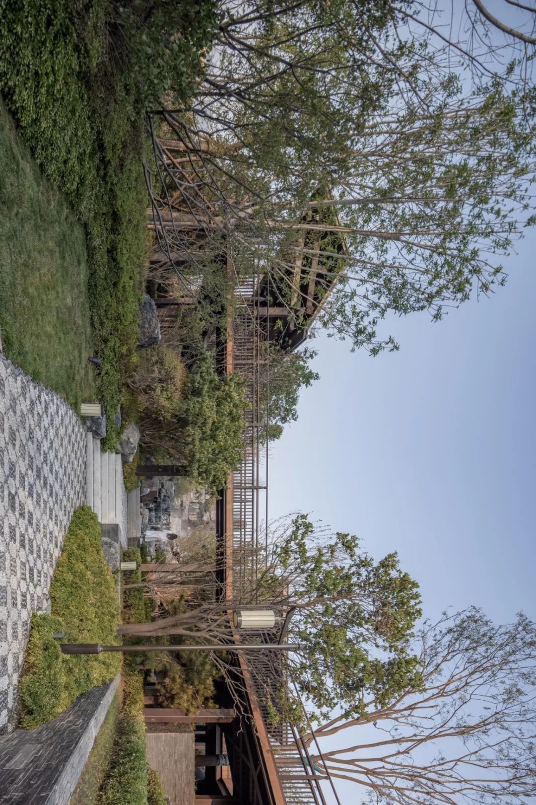 栈道在枝杈间穿梭,眼光流转在水云之中。走在空中或是栈下,看着不一样的风景,是空间的魔力,又像是时光的奥妙。夜幕降临,灯盏亮起,雾气缓缓充盈,这氤氲朦胧又增添了一分浪漫。