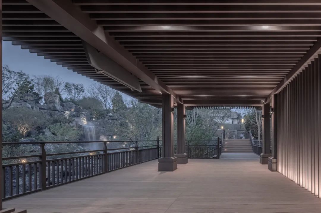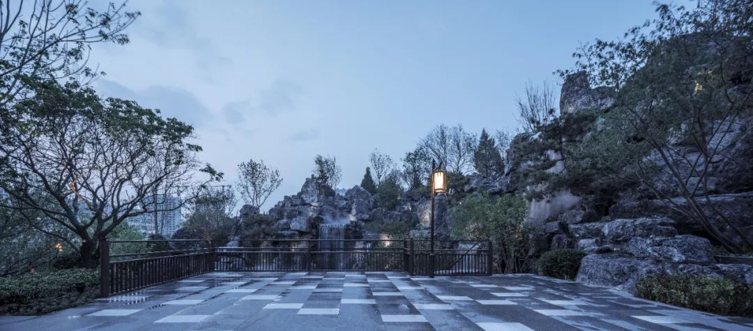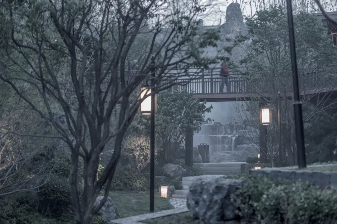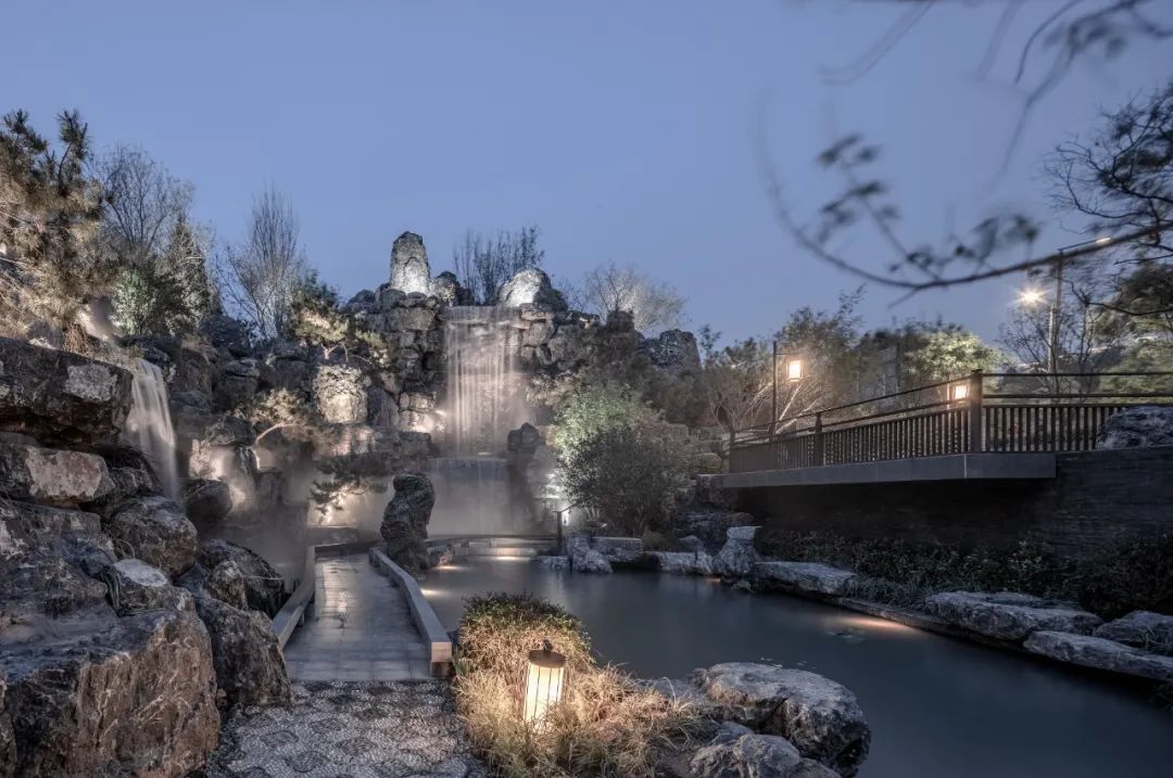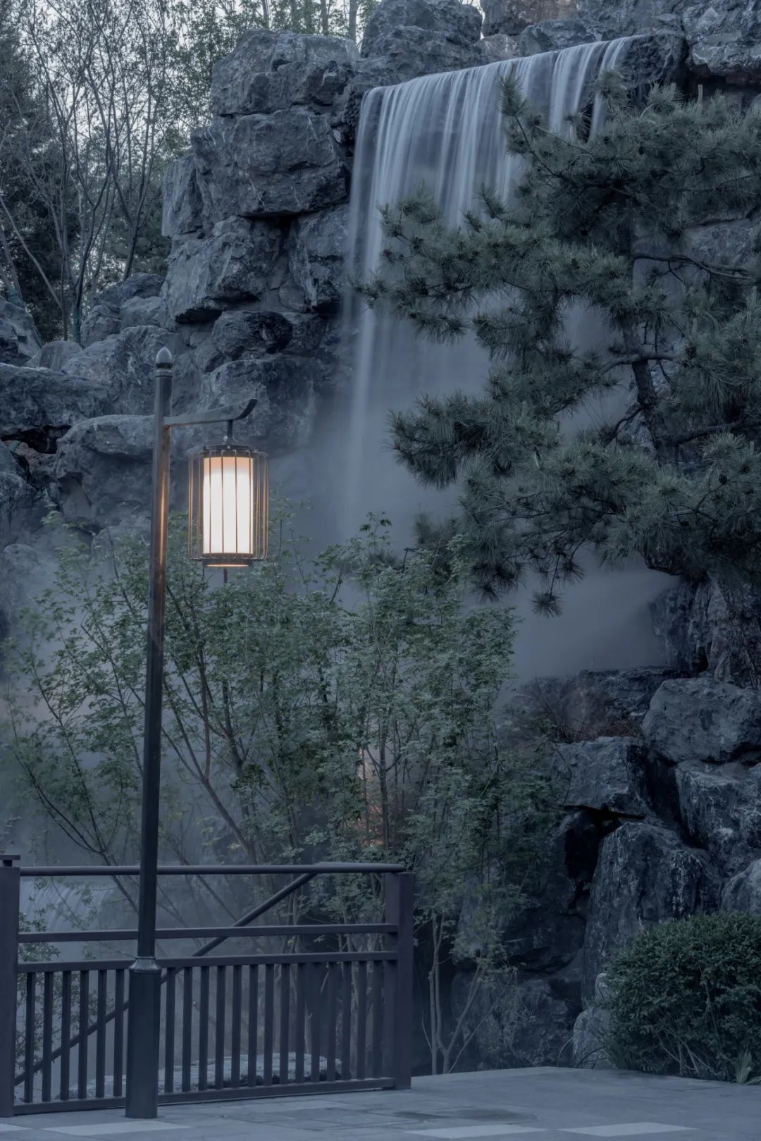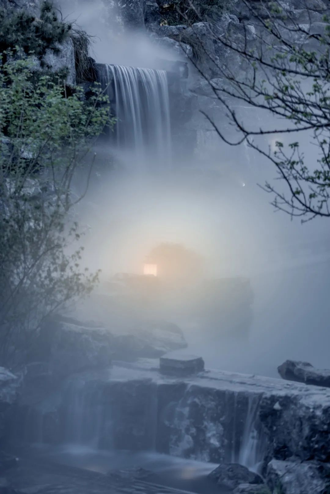 这里是公园的尽头,用一种磅礴的气势书写尾声。一泻而下的瀑布,荡起水雾,包裹着朦胧的灯光,让人隐约来到了一场风雅盛事。