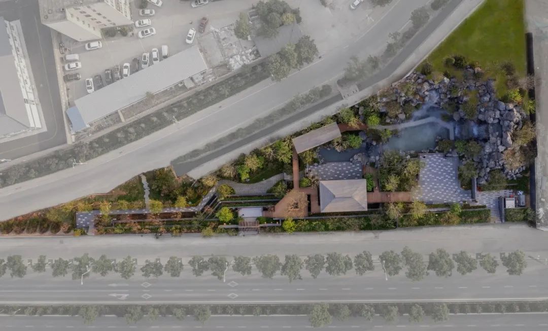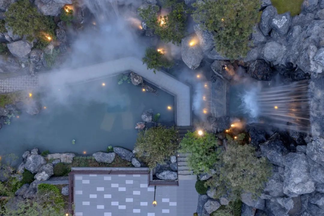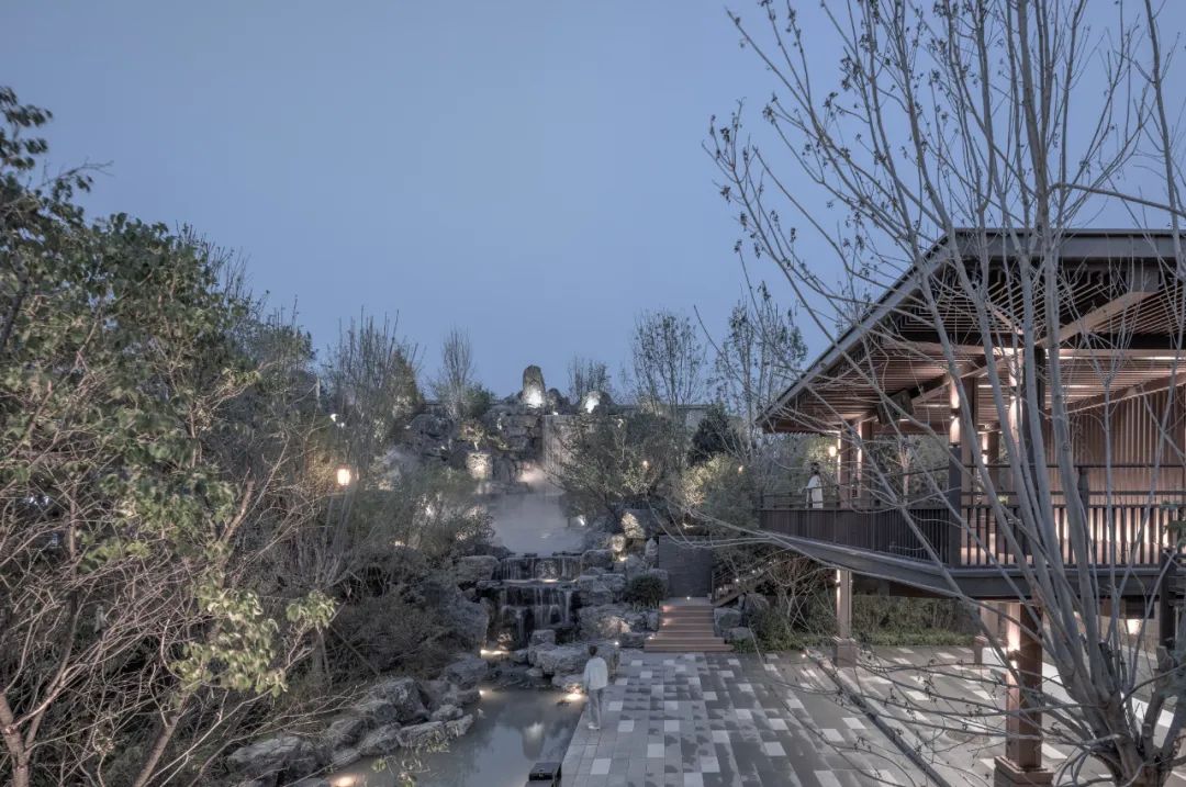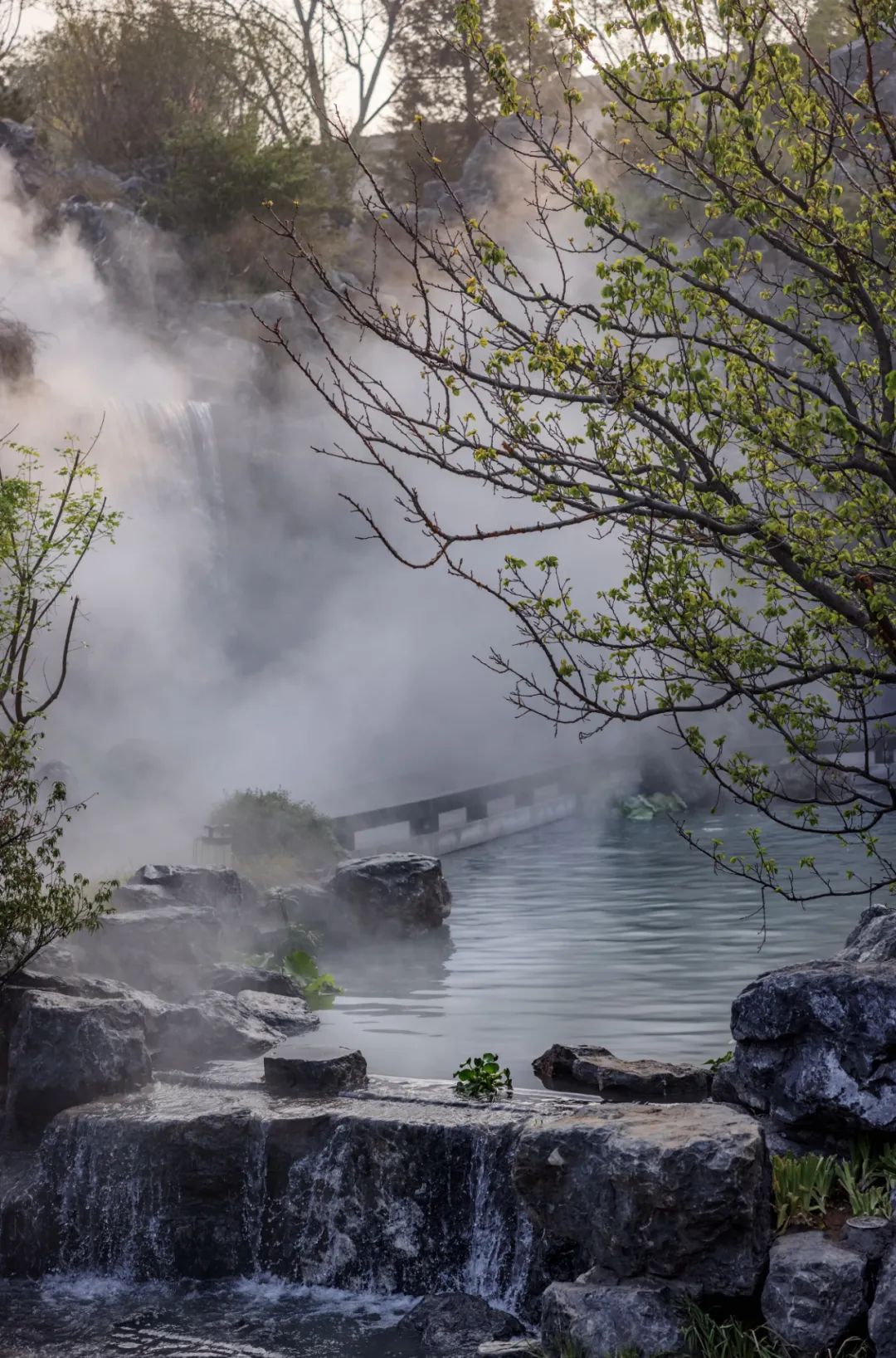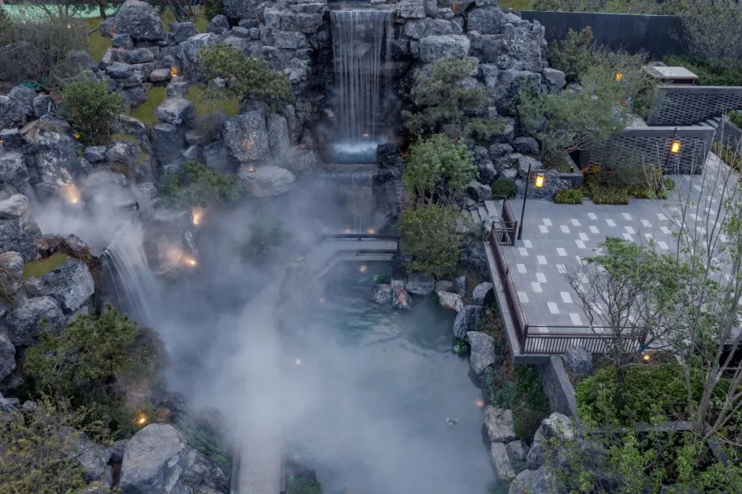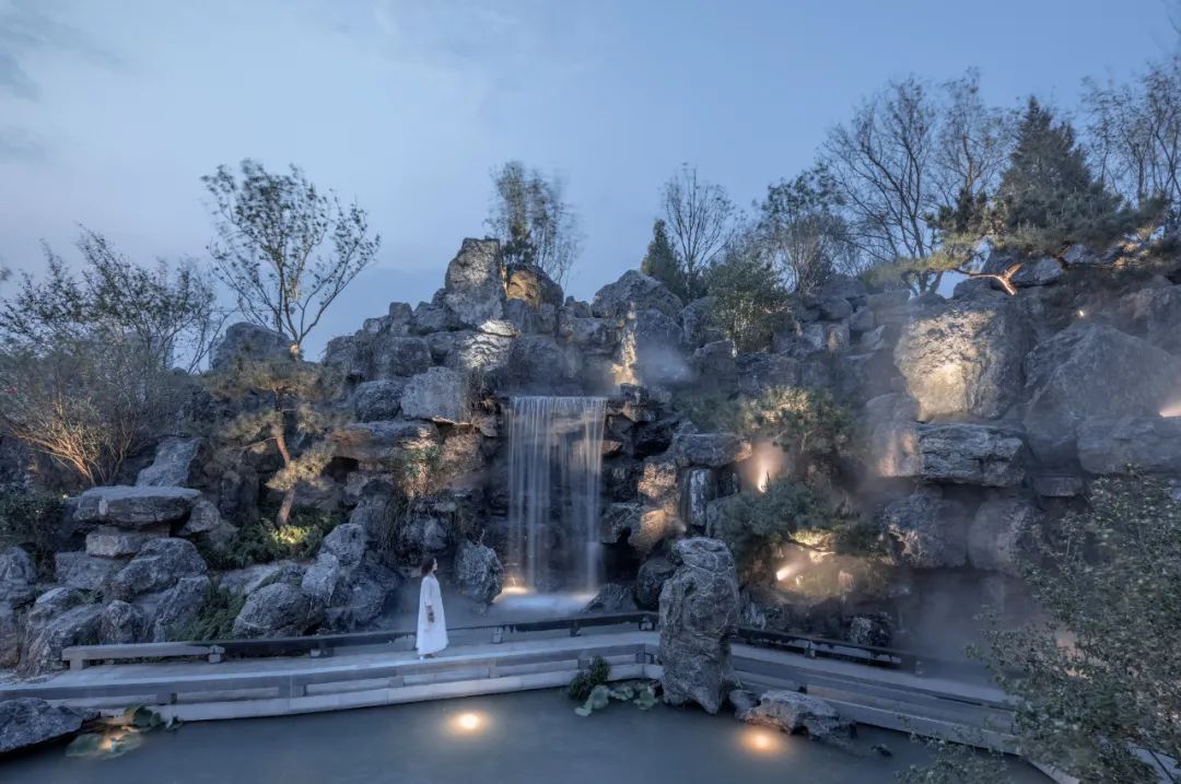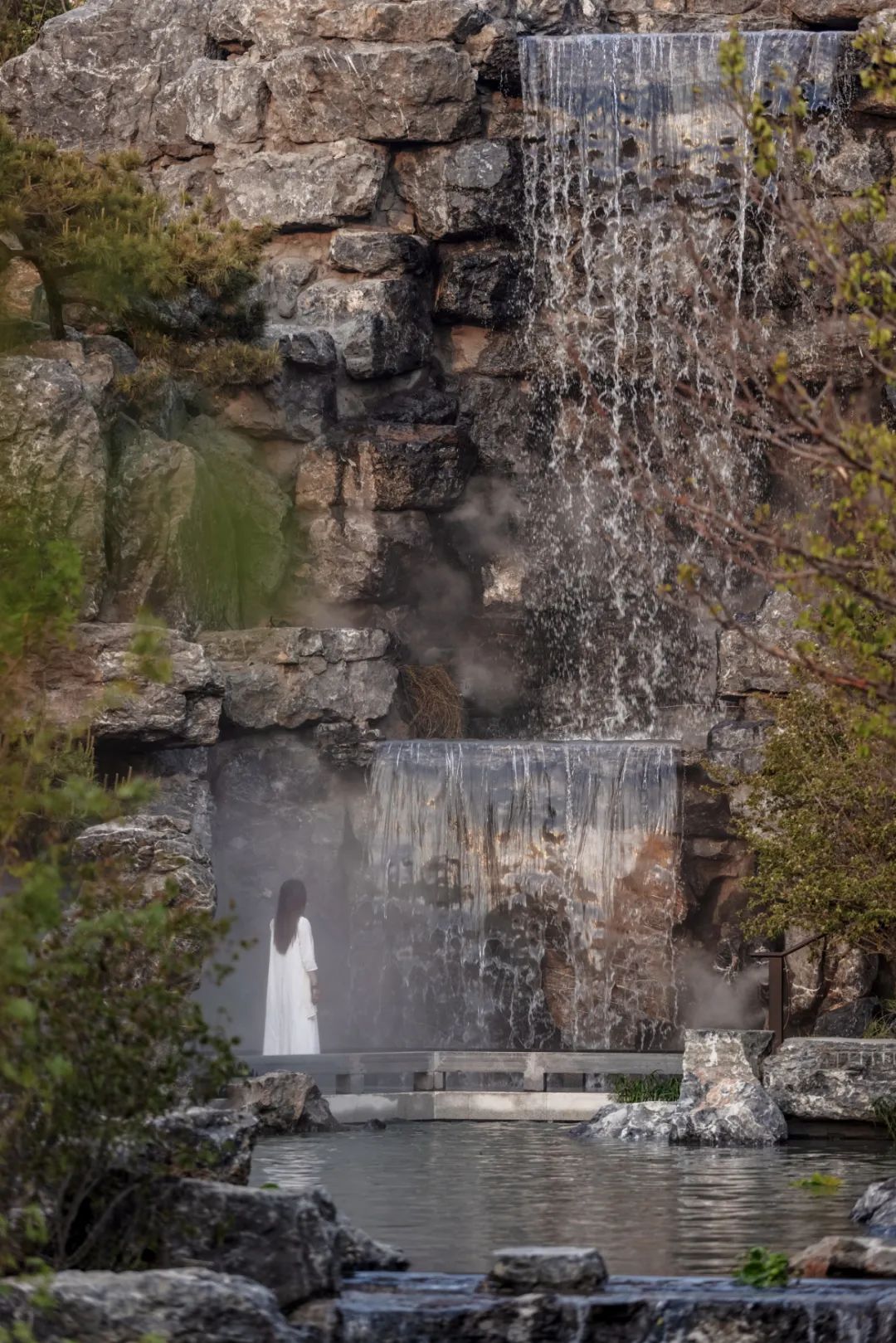 黑山石堆砌成山,重达2000吨,大小两个瀑布一泻而下。沿山种植松树,造一处山林秘境:高低错落、松德风雅。细品山石纹理的自然天成,感叹松树扎根硬石中生命的力量,任凭瀑布飞溅的水花洒在脸上。
