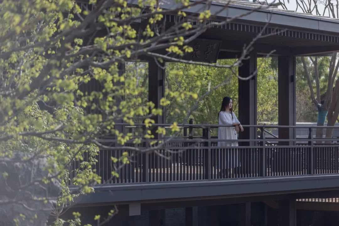 松泉亭中观松泉,廊下话说亭中友。长廊与松泉亭相望,亭下好友相聚、品茶长谈,廊下旅人信步、畅游流连。好像是展开的长卷,演绎着不同的故事,又同享一样的景色。