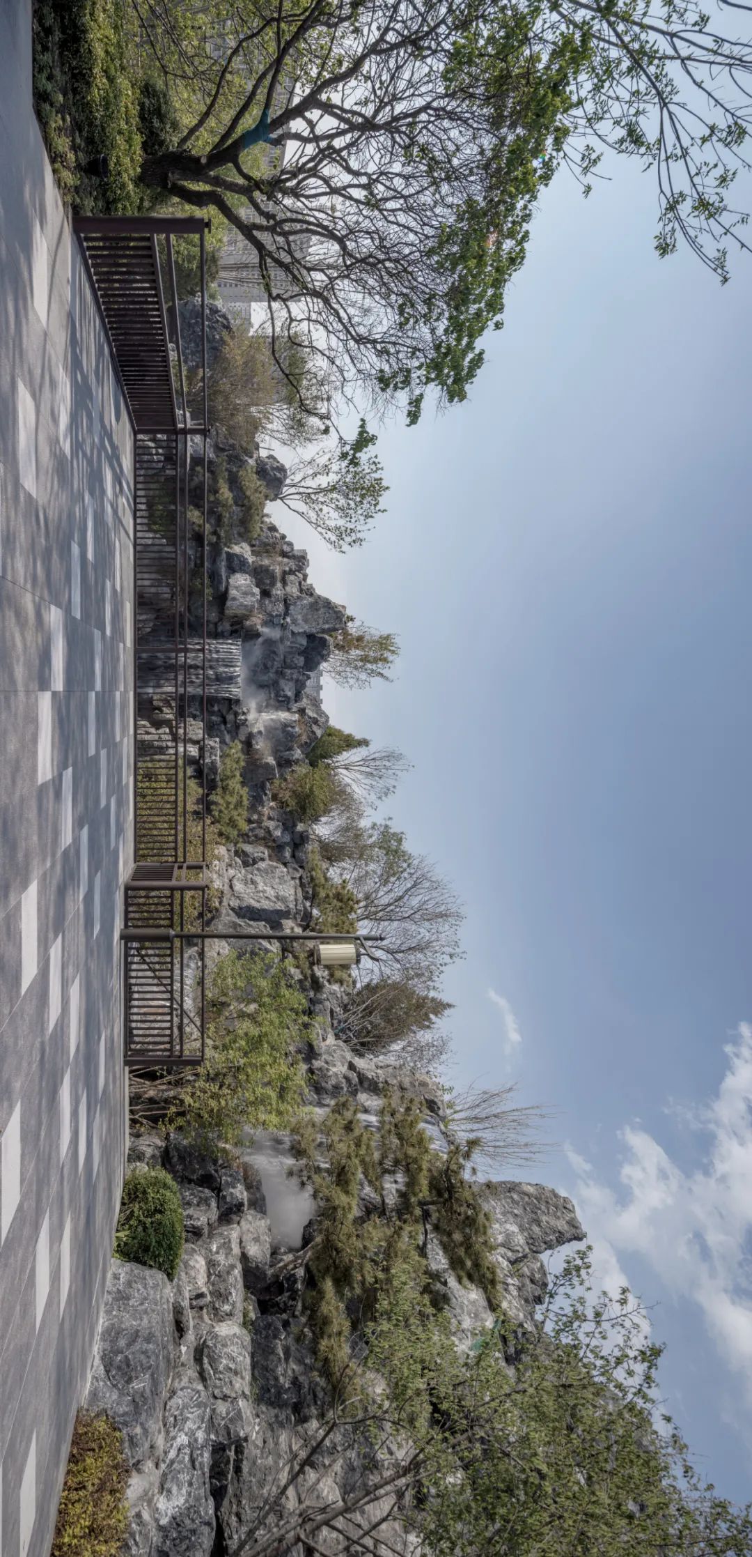 利用地面与市政道路间3.6m的高差,挑出一条净高2.7m、长约9m的空中栈道。西观染井吉野林;东观长流悬瀑。