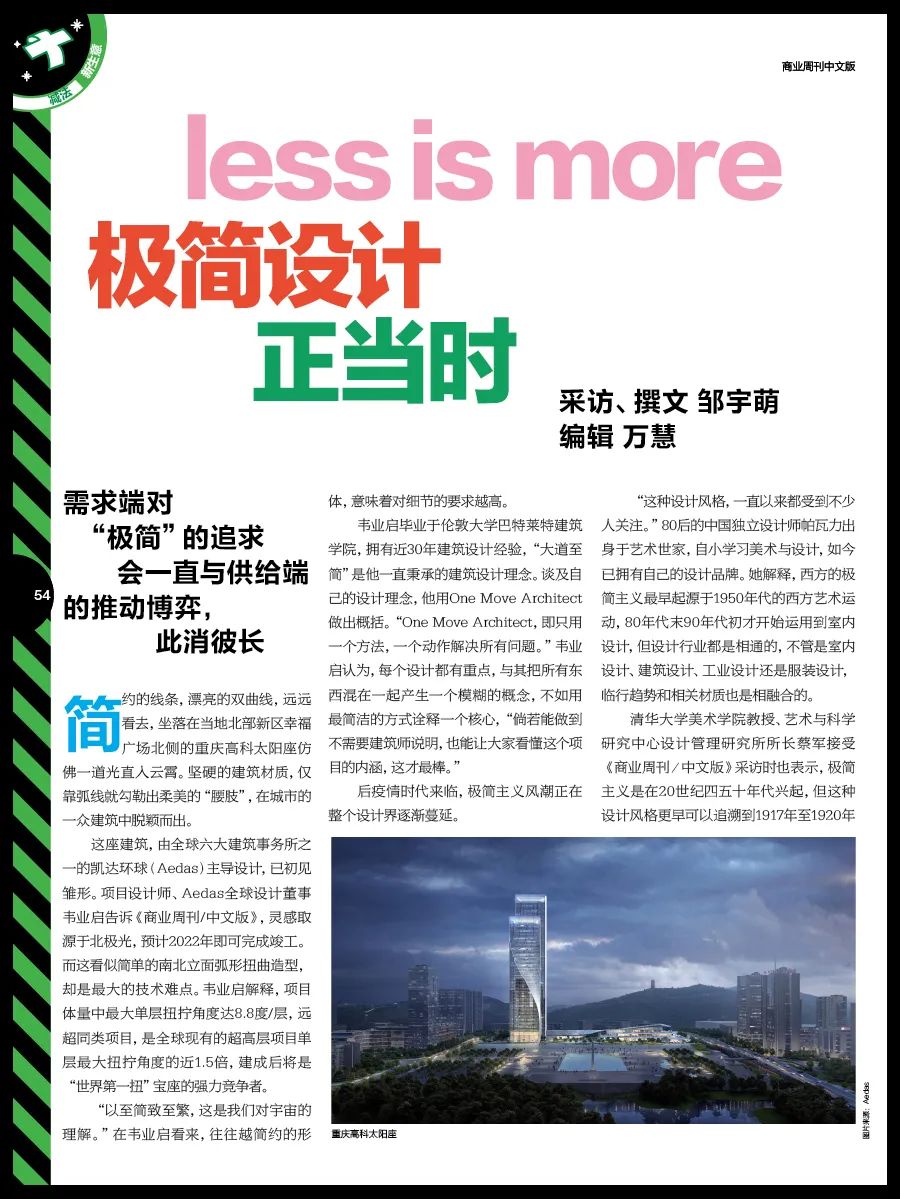 Aedas全球设计董事韦业启(Ken Wai)近日接受《商业周刊/中文版》(《Bloomberg Businessweek》)专访,以即将建成的重庆高科太阳座为例,分享了对于「极简设计」的思考与探寻。