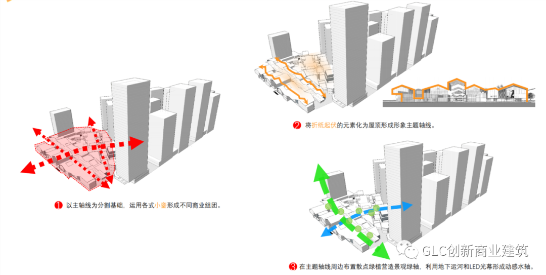 以主轴线为分割基础,运用各式小銮形成不同的商业组团。将折纸起伏的元素化为屋顶形成形象主题轴线。在主题轴线周边布置散点绿植营造景观绿轴,再利用地下运河和LED光幕形成动感水轴。