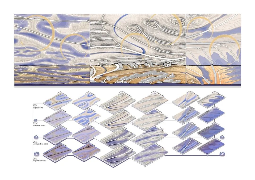 通过大量的案例,解读什么是弹性景观。理解设计师通过塑造地形、高差变化改变水陆分布,引导水在场地中的滞留与流动,从而形成弹性地景的概念。
