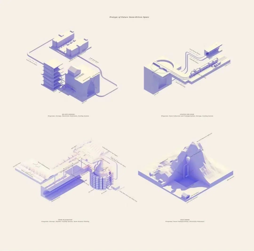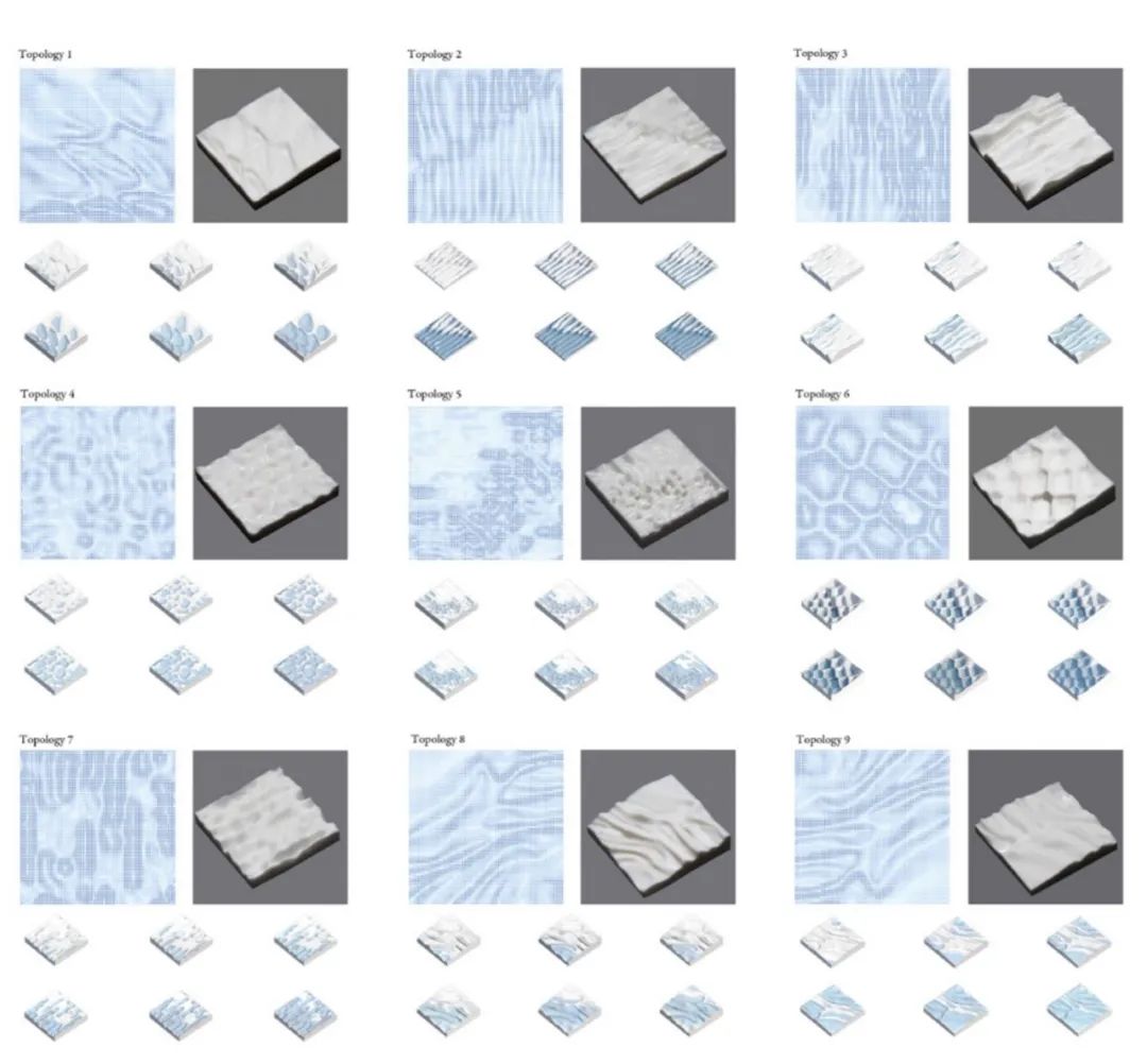 跳出传统设计思维,利用Grasshopper提取有机形态的自然肌理,转化为地形设计原型, 并使用C4D进行水流模拟动画制作。