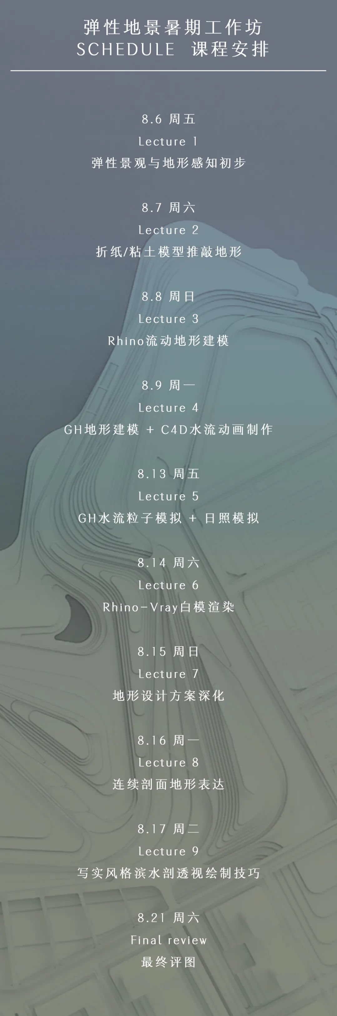 本次工作坊,学员将在10课时的学习中,打破固有的平面设计思维,利用参数化设计结合动手制作草模,展开一系列的地形实验。从prototype的设计,测试转化为设计成果。