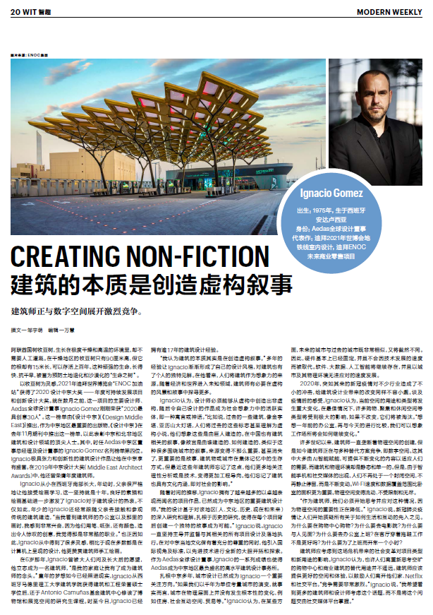 近日,知名期刊《周末画报》刊登了关于Aedas全球设计董事Ignacio Gomez对建筑设计领域的深度思考。 将其诸多具有价值和深远意义的观点进行了提炼和分享,涵盖他的成长经历、建筑设计生涯、中东建筑设计、创新可持续、疫情之后城市空间发展等丰富内容。