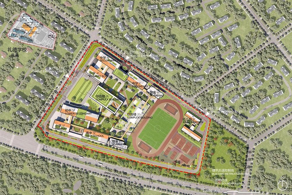 为确保总体规划满足学校需求的同时与学校特色完美融合,设计采用紧凑连续的布局方式,将哈罗国际学校置于地块北侧边界,礼德学校置于地块南侧边界,两者之间设有共享设施, 如游泳池、餐厅,以确保双方均可便捷使用,而运动场位于教学楼东侧,方便学生自由进入。