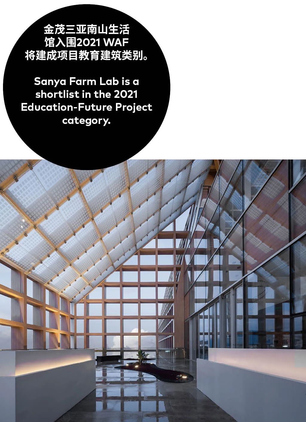 柯路建筑在2020年参与WAF评选的概念设计——金茂三亚南山生活馆,成功入围2021年WAF世界建筑节大奖未来将建成项目(Future Project)的教育建筑类别。