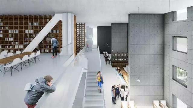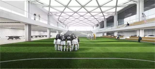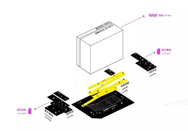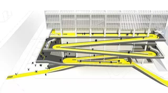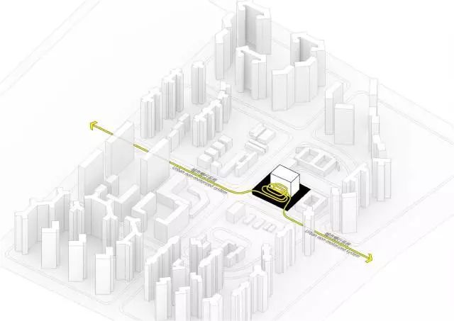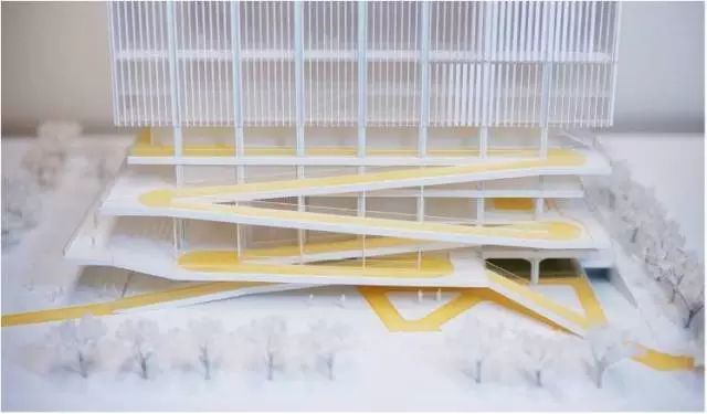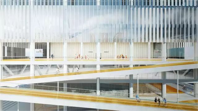 项目50%的面积都作为24小时开放空间,坡道由城市慢行系统延伸到建筑24米标高处的篮球场,形成立体绿道。作为城市绿道的延伸,坡道串联运动场地,剧场和社康服务中心。每一段坡道的尽端,都是一个放大的休息平台,构建大量的户外城市共享空间,与城市的慢行系统融为一体。让整个建筑成为市民活动的舞台。增强全民健身运动的可达性,让文体中心成为激发全民健身运动的空间热点。