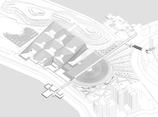 这是一座公共文化建筑综合体,包含一个1200座的剧场,以及规划展览馆、博物馆、图书馆、文化馆和青少年活动中心,共5层,高24米。人们可以穿过建筑从山体到达水边,沿途浏览建筑内部的各项活动。