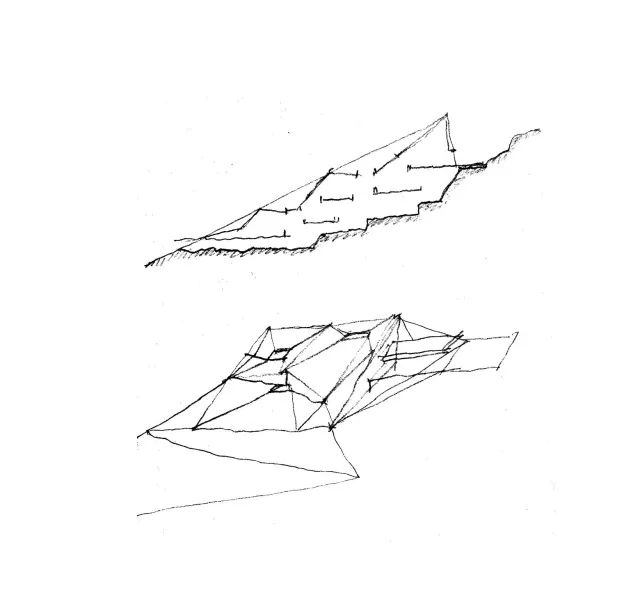 中国院落的组成方式给了我们阐释云阳本土历史文化的灵感。我们引入的九宫格空间结构,将分设的九个院落汇聚形成整体。其中,院落倾斜的顶面既是屋面也是建筑的主立面,以契合江岸堤坝的角度层层跌落,延伸至江水之中,填补了山与江的间隙。而院落中的天井引入自然光线,同时也模糊了室内外的差别,形成一个具有开敞气氛的立体城市聚落。各单元天井的位置与形状的差异,使四周斜面的坡度产生变化,从而使斜面上台阶的走向与宽窄各异,形成变化的肌理。采用本土地域建筑的屋顶形式,营造出历史和文化意味浓厚的城市空间,向传统中永恒的表达致敬。
