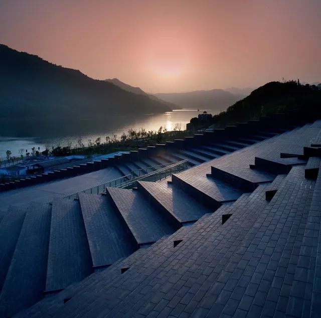 云阳市民活动中心项目位于重庆三峡沿岸的历史城镇——云阳,由一个富有戏剧化的建筑界面和几何完型的两江广场组成。它用江岸堤坝的形态和水发生联系,以与大坝角度相似的线条融入山体的轮廓。