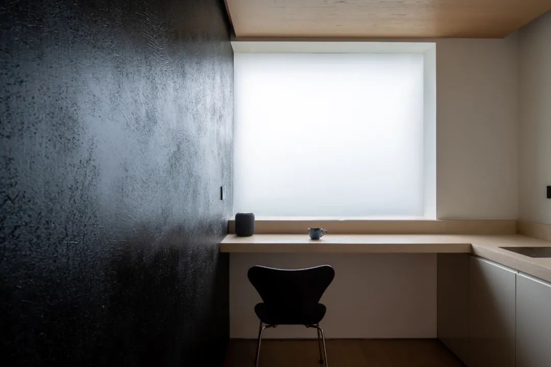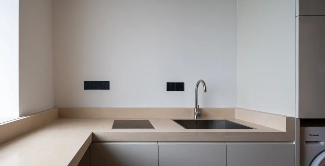 极简纯净的静谧工作台沿窗布置,工作台台面延伸至另一侧墙面成为餐台和水池,台面由两块砂岩密拼制成,质感柔和温润。