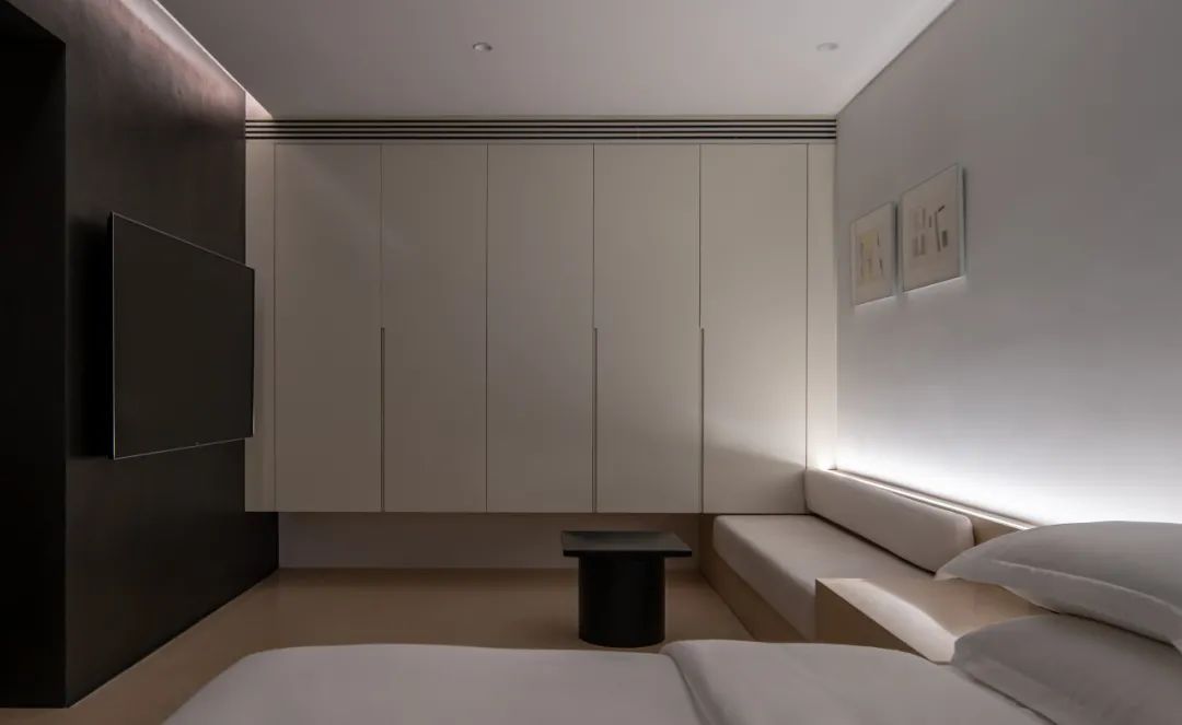 如开篇所说,整个设计中,我们希望能够营造并不断加强城市民宿所不具备的特性,也就是脱离城市的隐居感,最终这种感受得以在空间中呈现,身处于城市中的商务民宿,却拥有一种与世隔绝的静谧感,在这里的时间也是逃离都市的时间,这样一种寄托于感受的温柔的空间介入手段,在此项目中得以完美呈现。