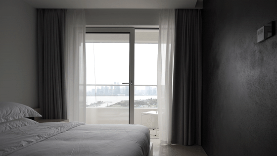 通过黑色墙体中央的开口,可进入内部的卧室空间。进入内部空间后,越过床透过阳台可看到远处的钱塘江,虽然在此时空间内与城市发生了视觉联系,但极简柔和的光线和材质仍维持了与世隔绝的静谧感受,身处房间当中,看到的城市还是熙熙攘攘,但身处的空间却仍旧私密安静。
