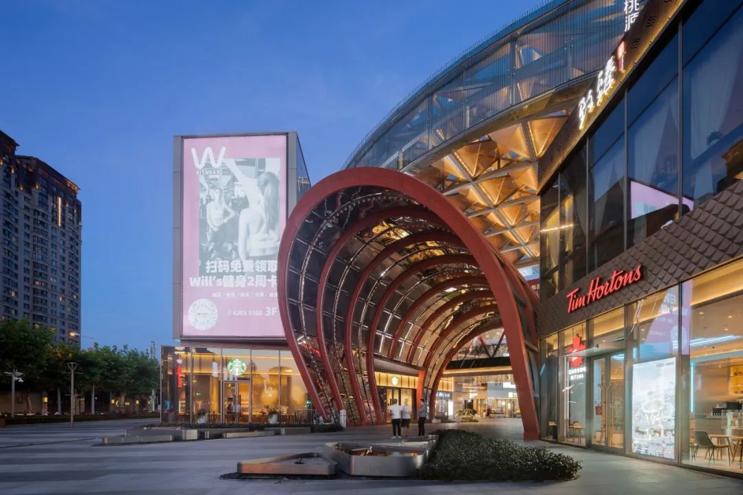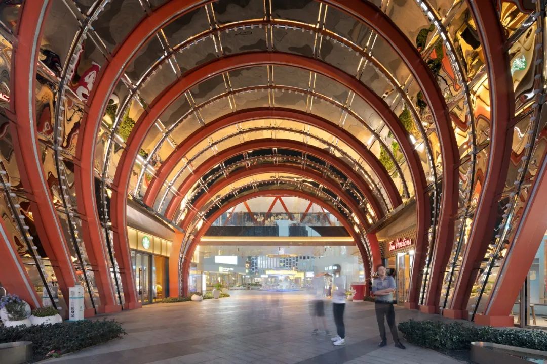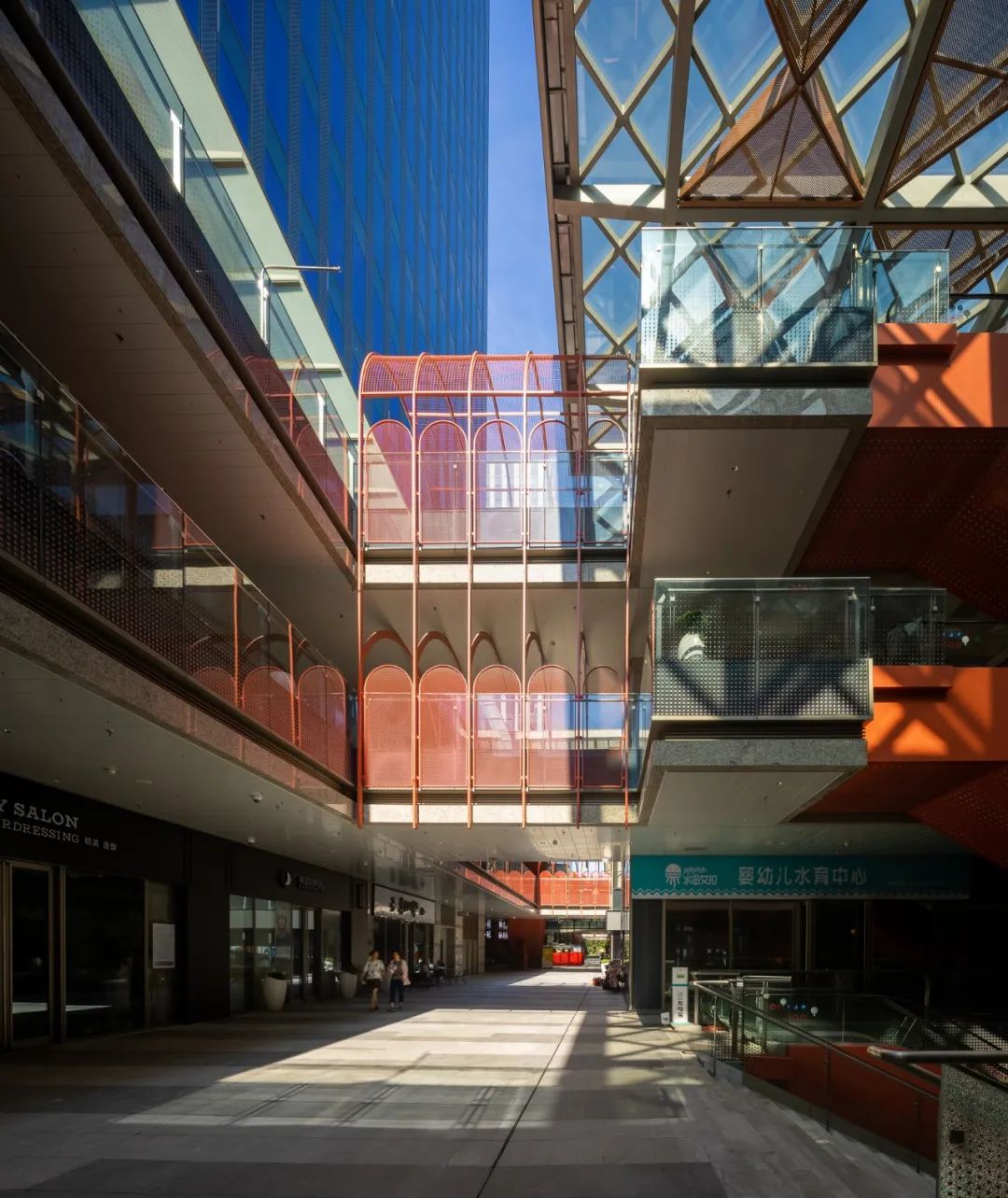 商环境设计阶段,整个商业空间中植入了更多的情景化营造。入口的拱门、红色金属格栅等如同一件件街道上的“家具”,强化了亲切、富有趣味的街道氛围。