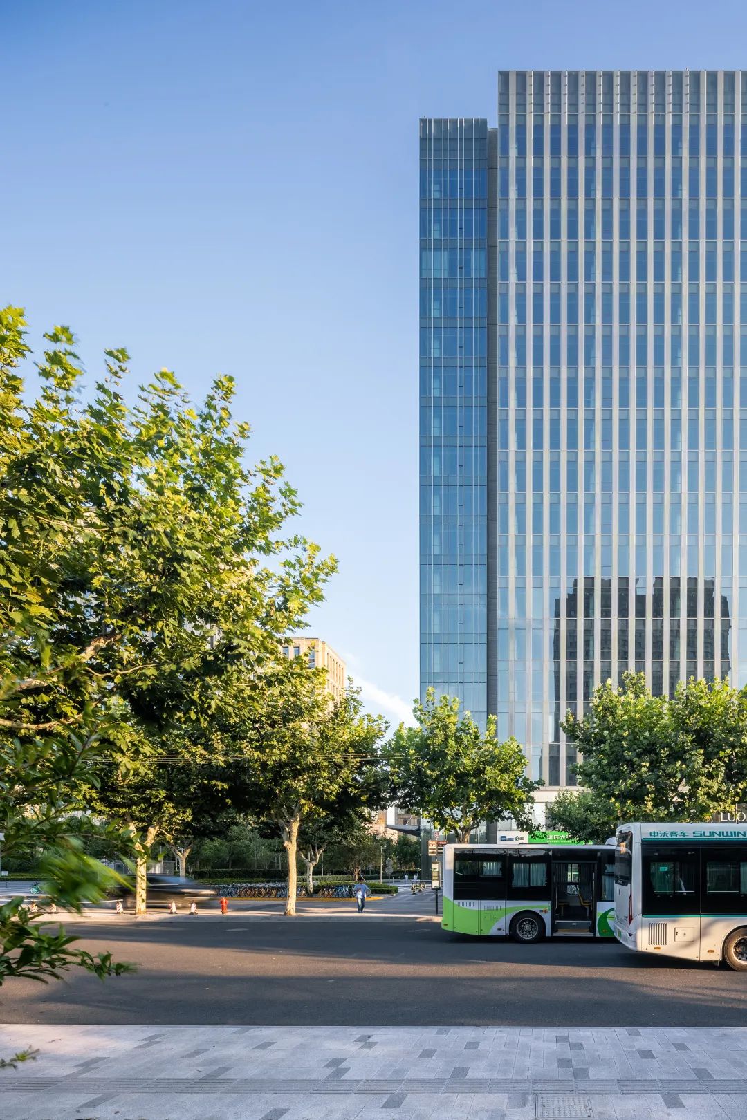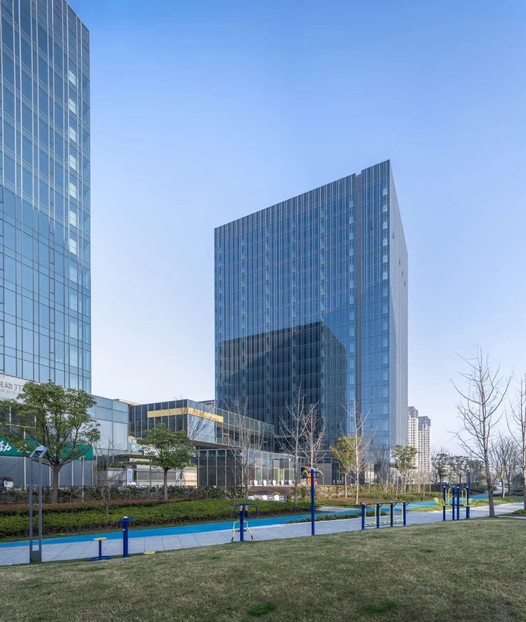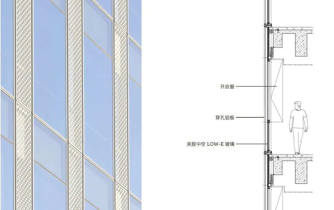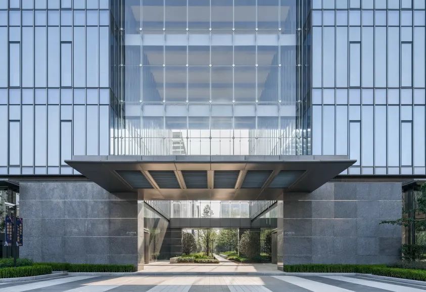3幢甲级办公立面以蓝青色玻璃幕墙为主,有统一的分割模数。同时,通过穿孔铝板的设置形成两种开启扇部位做法,使得单一的玻璃幕墙立面呈现出虚实对比、节奏分明的状态。个别细部,包括地面悬浮钢雨棚、单元式幕墙的勾边处理等都传递出精致感。