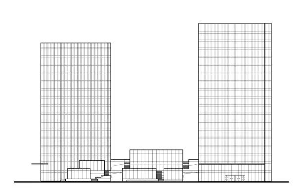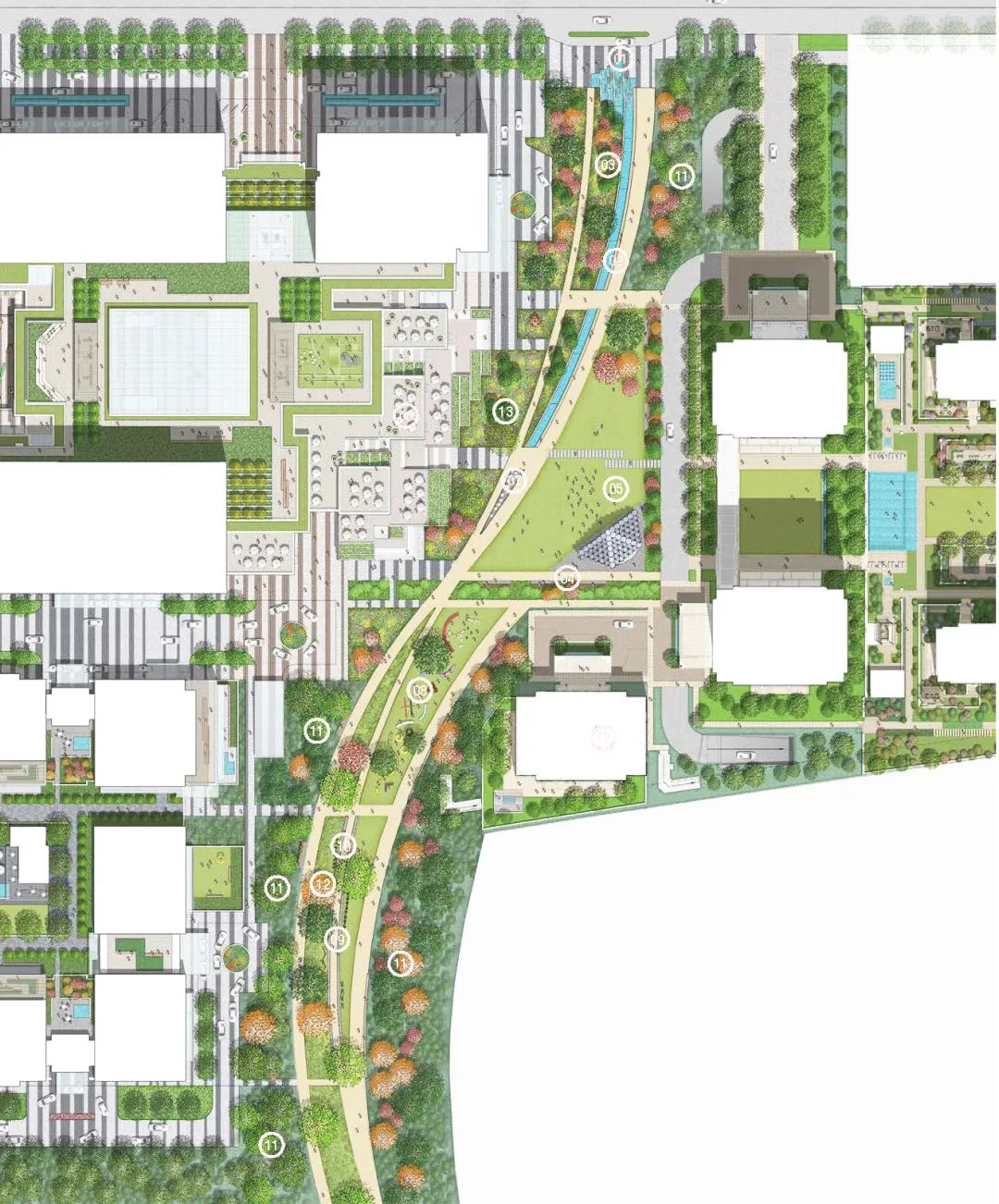 项目是一次综合开发,分三期完成,包括商业、甲级办公、总部办公、公寓等。地块形状不规则,上位规划中一条城市绿带从中间穿过。漫长的开发时序、分裂的场地现状给整个项目整体性的实现带来一定挑战。如何在此基础上仍然给城市带来一座吸引人的崭新街区,是设计的思考点。