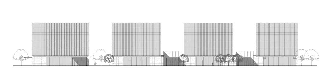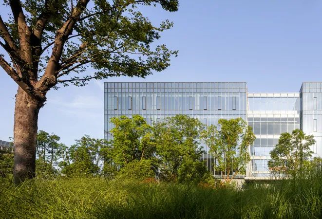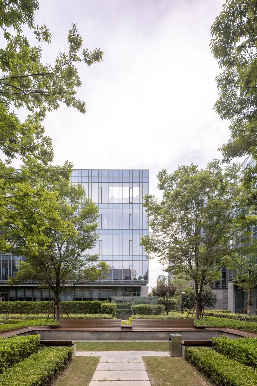 四层的高度与树冠的高度达成一种和谐,极为平坦的玻璃立面上,景观倒影成为了主角。在很多角度看,建筑群仿佛消隐在一片茂盛的绿色之中。建筑朝向绿带的位置设置有供人停留的灰空间,光和风可以穿过,花园景观绿植一直延伸到脚下。景观和视线的渗透模糊了室内外界限,给方盒子建筑物增添了优雅、灵动的氛围。