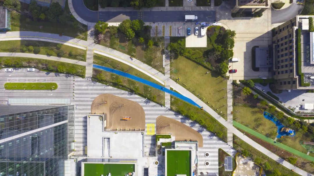 总部办公组团包含10座带有屋顶露台的四层点状小楼,采用十二宫格的格局进行布置,在个别部位加以连缀、错位以破除单调。这些楼栋共同围合成一个矩形的静谧花园,整组建筑与地面景观融合在一起。