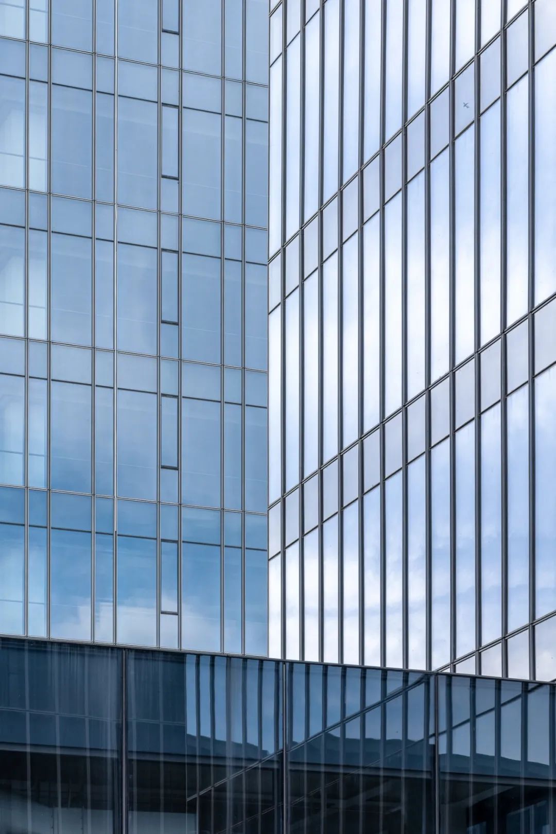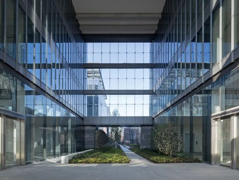 总部办公建筑沿用了同甲级办公相同的分割模数。同时在近人尺度上增加石材面,更贴合内向花园的温馨氛围。在与景观相联通的部位,超白玻璃的运用满足视线穿透的需要。