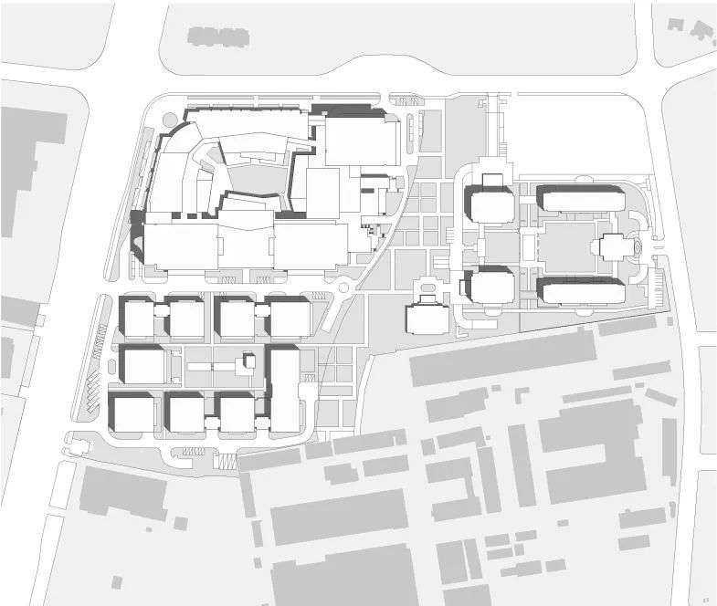 规划思路很快被提出:“塑造三个带有院落的组团(尺度均在150m*250m左右),满足不同的开发分期和功能需求,同时以强有力的公共空间体系强化整个街区的空间秩序,加强各组团之间的联系。”三个组团分别是东侧的公寓&SOHO组团、西南角十二宫格结构的总部办公组团以及西北角的街区式商业&甲级办公组团。在最初的规划图纸上,各组团建筑和院落之间就被控制以严密的轴线对位关系。