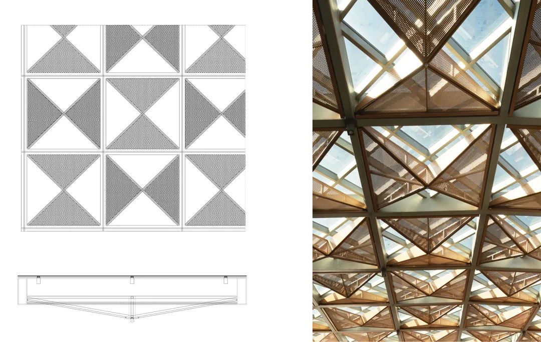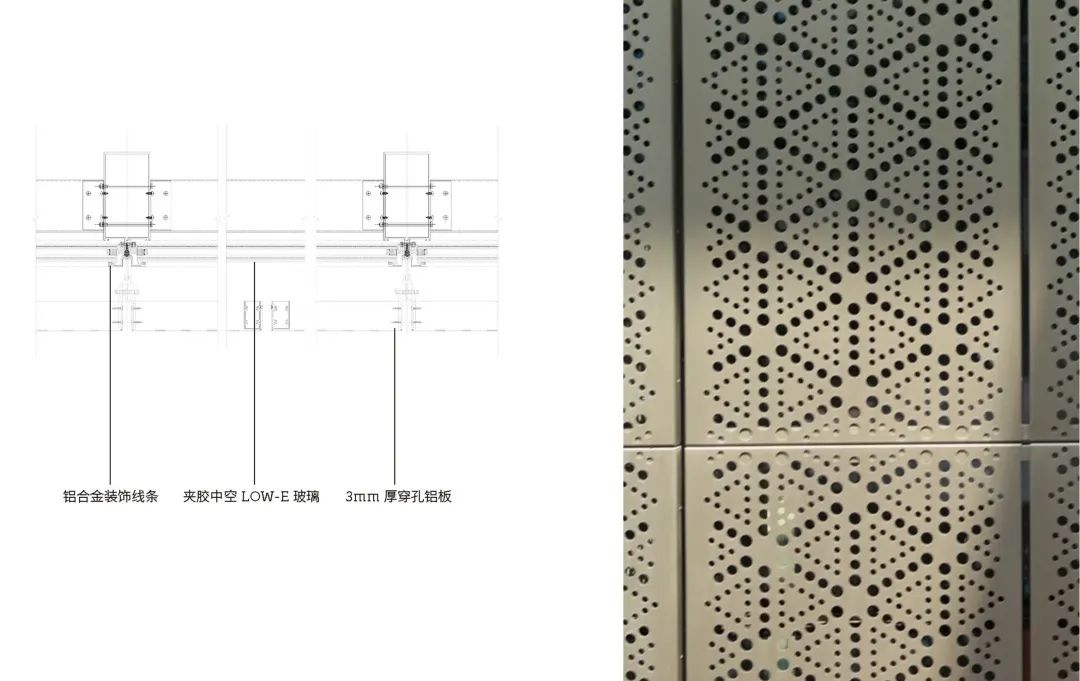 商业部分整体色调偏暖,重视以多样材料、多种颜色的拼贴组合营造活跃的氛围。仅玻璃一项即包括不同透光率、不同色调的中空Low-E玻璃、彩釉玻璃、高透玻璃等,此外还引入不同种类的石材、穿孔铝板等。多处穿孔铝板的运用不仅满足了城市设计规则中对于建筑玻墙比的要求,也满足灯光投射需求。