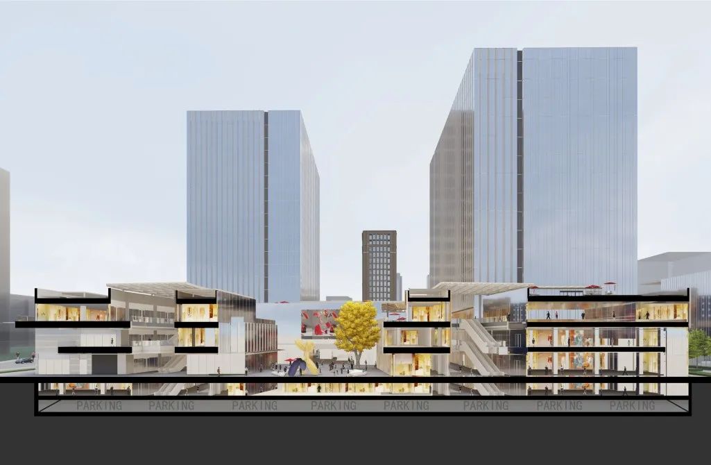 活动广场采用60m*30m的尺度与近1:3的高宽比,以硬质铺装的形式满足多种活动需求。商业的三层设有折线形的凸出露台,拟作为酒吧、轻餐饮的外摆空间,与广场地面具有良好的视线互动关系。