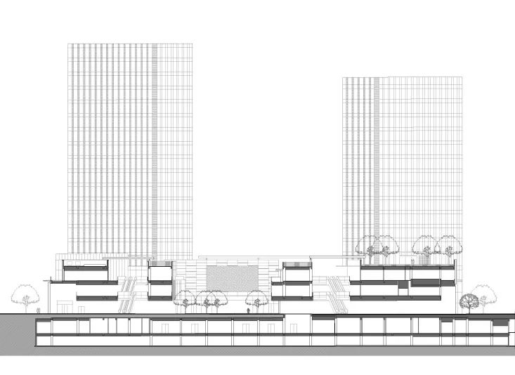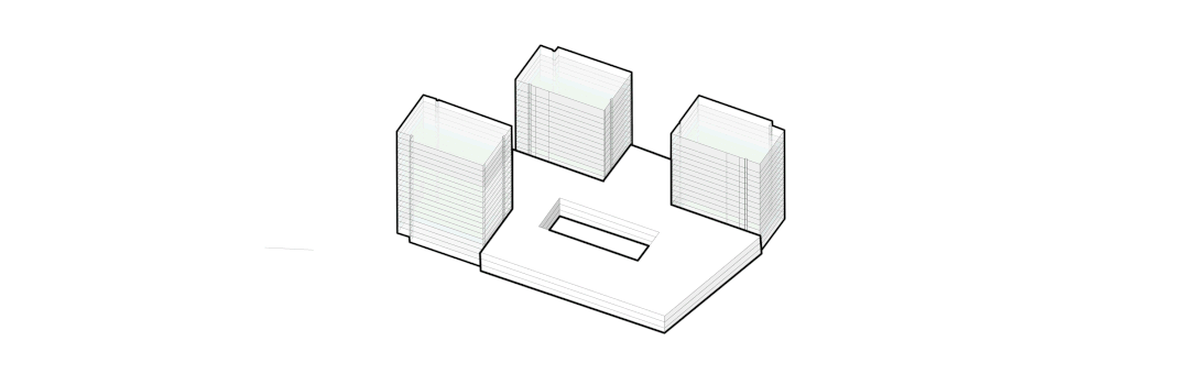 中央的绿带宽约30米,在北侧经过空间放大形成一处110m*90m的方形花园。方形花园的四周,建筑师对于裙房建筑体量进行“化整为零”的处理,以体量的切分、像素化、退台等手段,让建筑物与绿带之间的边界变得更为柔软。上上下下的立体路径引导人们在绿带与商业办公之间来回自如游走,并获取丰富的视线及步行感受。从公共绿带望向建筑集群,交错、悬挑、堆叠方盒子形成一组生动而亲切的画面。